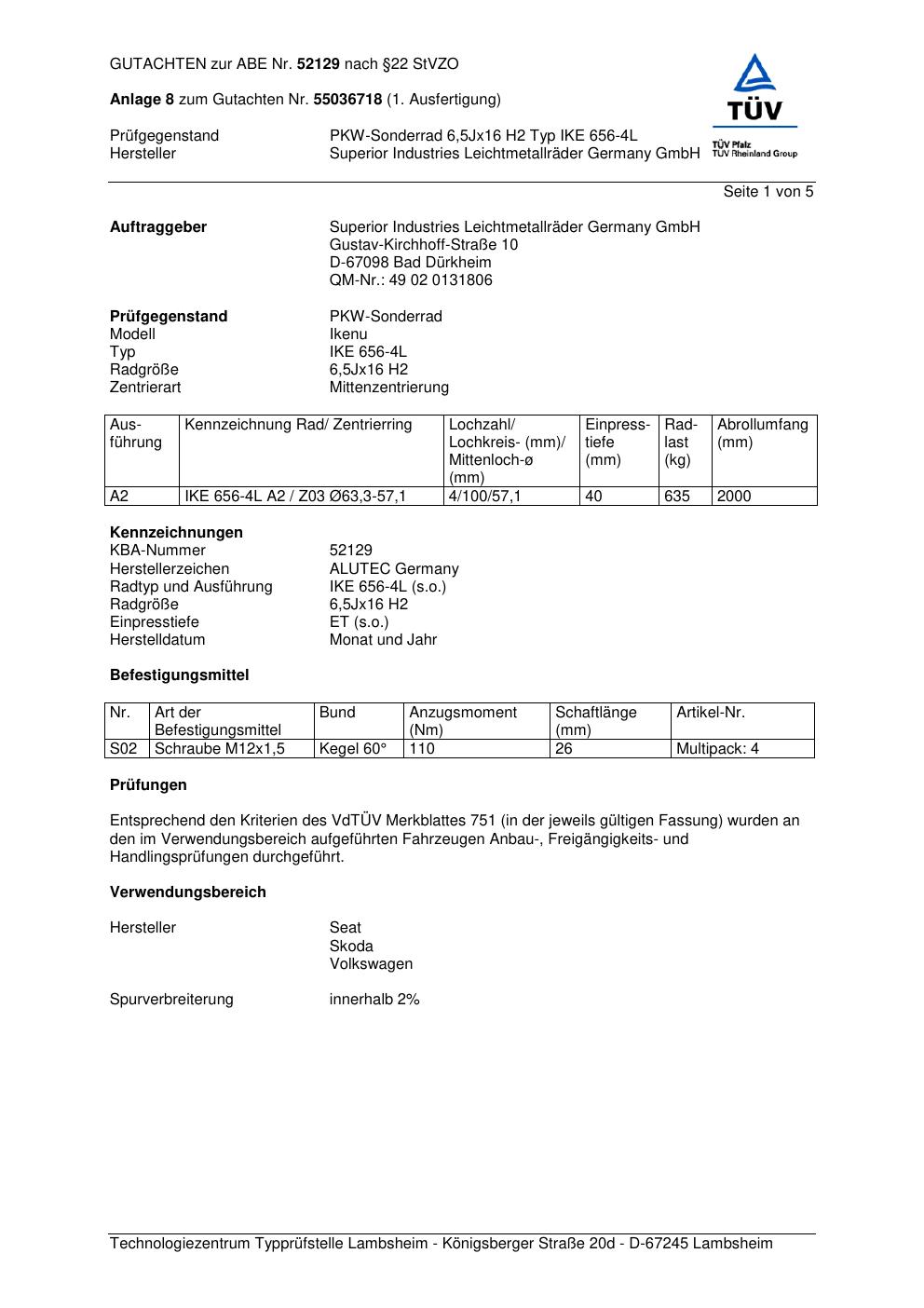 Felgengutachten / abe für Alufelgen ALUTEC IKE 656 -4L (6.5Jx16 ET 0, Mittenloch 0 mm) mit KBA 52129 (Zertifikatsnummer 52129). Hier kostenlos als PDF herunterladen. Der Download-Link ist 24 Stunden gültig und kann bis zu zwei Mal verwendet werden.
