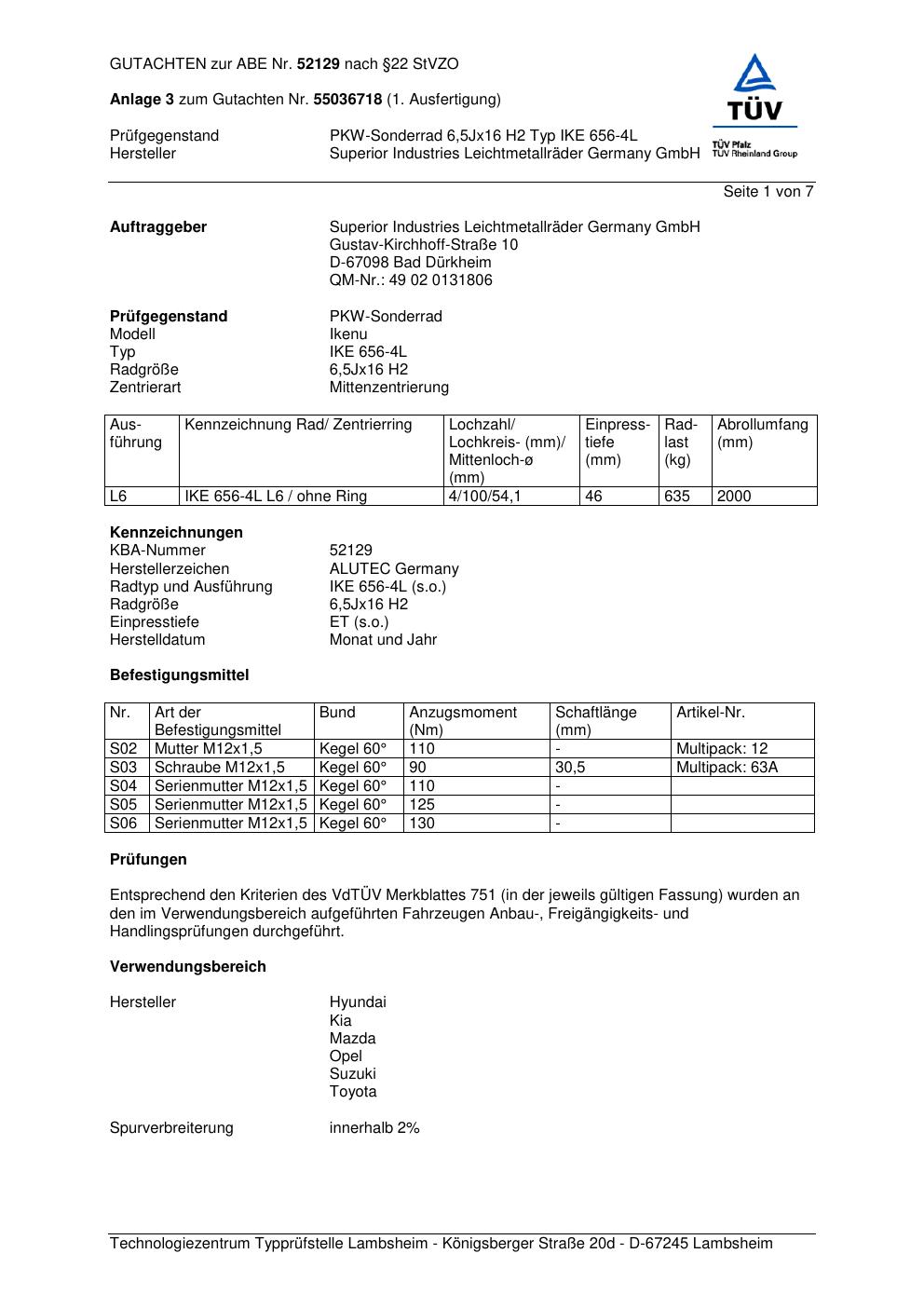 Dieses Gutachten (abe) bezieht sich auf die Alufelge ALUTEC IKE 656 -4L in der Ausführung 6.5Jx16 ET 0, Mittenloch 0 mm (KBA 52129). Im PDF findest du typischerweise zulässige Reifengrößen, Auflagen/Anbauhinweise und – je nach Dokument – Hinweise zur Eintragung.