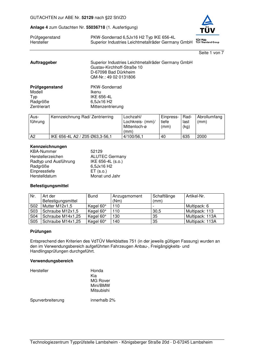 Dieses Gutachten (abe) bezieht sich auf die Alufelge ALUTEC IKE 656 -4L in der Ausführung 6.5Jx16 ET 0, Mittenloch 0 mm (KBA 52129). Im PDF findest du typischerweise zulässige Reifengrößen, Auflagen/Anbauhinweise und – je nach Dokument – Hinweise zur Eintragung.
