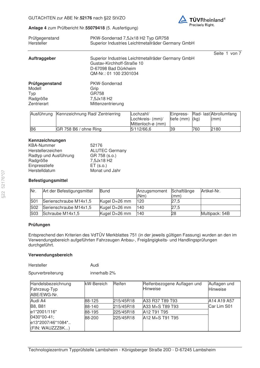 Dieses Gutachten (abe) bezieht sich auf die Alufelge ALUTEC GR758 in der Ausführung 7.5Jx18 ET 0, Mittenloch 0 mm (KBA 52176). Im PDF findest du typischerweise zulässige Reifengrößen, Auflagen/Anbauhinweise und – je nach Dokument – Hinweise zur Eintragung.