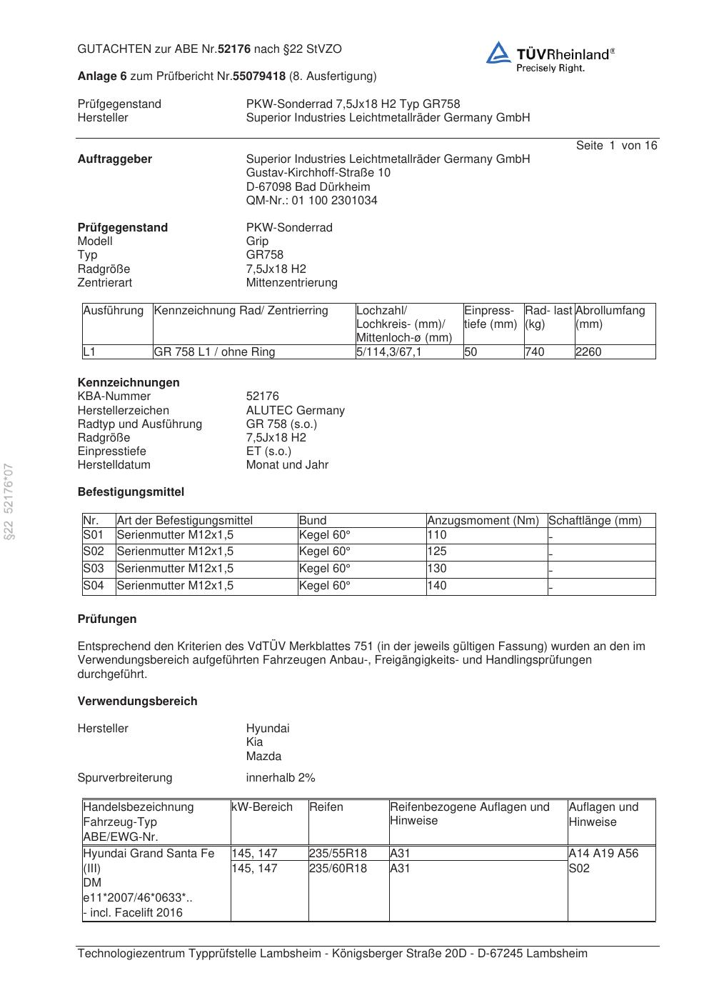 Dieses Gutachten (abe) bezieht sich auf die Alufelge ALUTEC GR758 in der Ausführung 7.5Jx18 ET 0, Mittenloch 0 mm (KBA 52176). Im PDF findest du typischerweise zulässige Reifengrößen, Auflagen/Anbauhinweise und – je nach Dokument – Hinweise zur Eintragung.