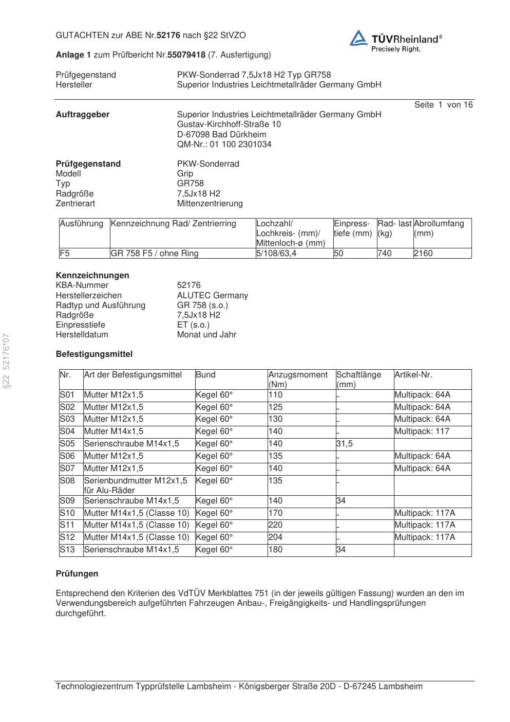Dieses Gutachten (abe) bezieht sich auf die Alufelge ALUTEC GR758 in der Ausführung 7.5Jx18 ET 0, Mittenloch 0 mm (KBA 52176). Im PDF findest du typischerweise zulässige Reifengrößen, Auflagen/Anbauhinweise und – je nach Dokument – Hinweise zur Eintragung.