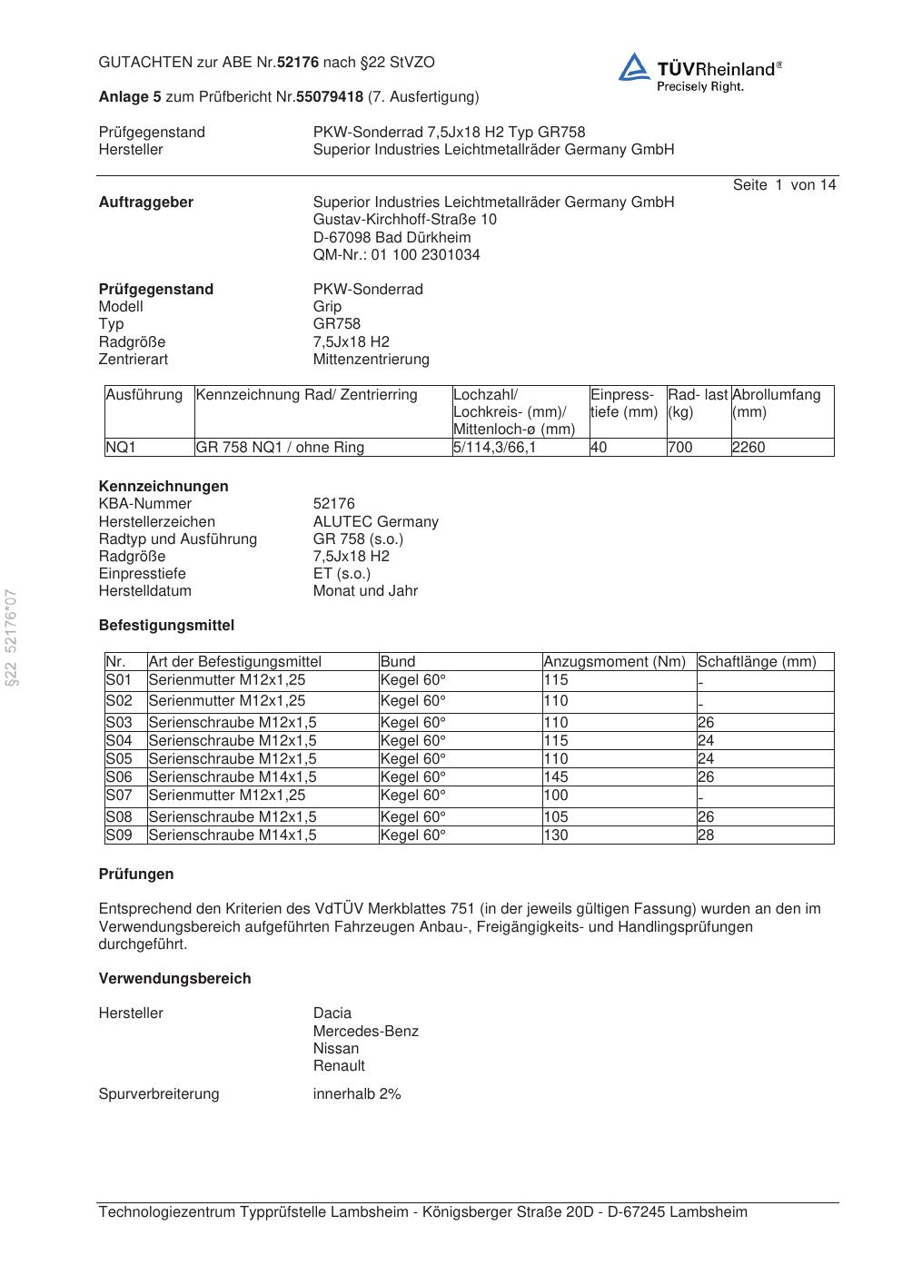 Dieses Gutachten (abe) bezieht sich auf die Alufelge ALUTEC GR758 in der Ausführung 7.5Jx18 ET 0, Mittenloch 0 mm (KBA 52176). Im PDF findest du typischerweise zulässige Reifengrößen, Auflagen/Anbauhinweise und – je nach Dokument – Hinweise zur Eintragung.