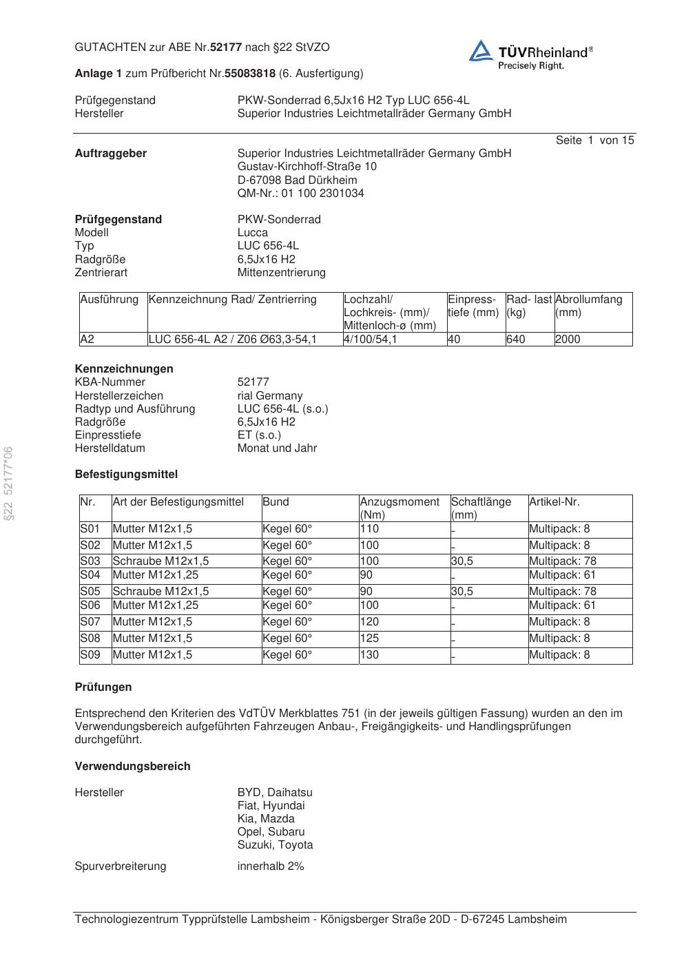 Dieses Gutachten (abe) bezieht sich auf die Alufelge brand-rial LUC 656-4L in der Ausführung 6.5Jx16 ET 0, Mittenloch 0 mm (KBA 52177). Im PDF findest du typischerweise zulässige Reifengrößen, Auflagen/Anbauhinweise und – je nach Dokument – Hinweise zur Eintragung.