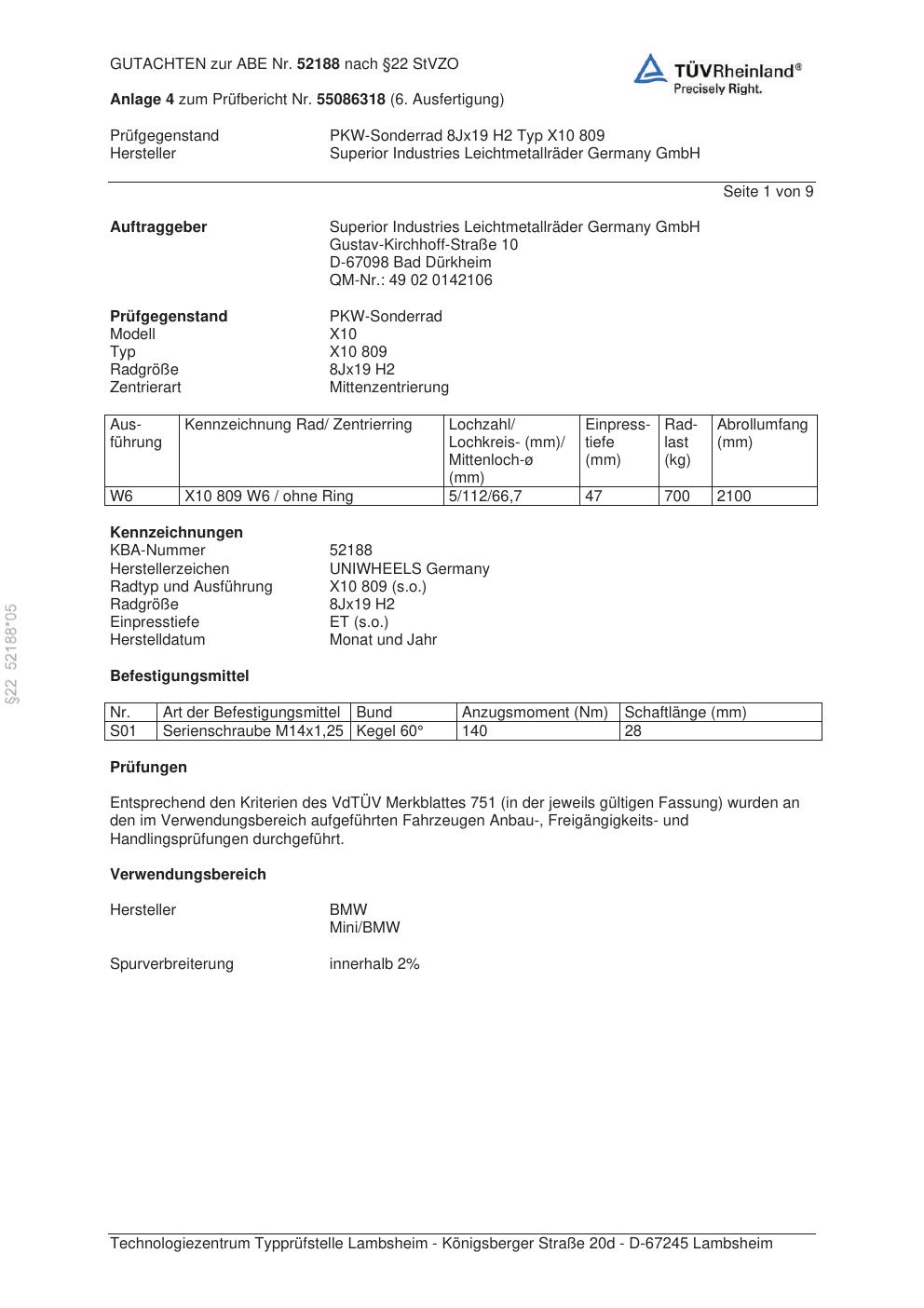Dieses Gutachten (abe) bezieht sich auf die Alufelge Superior X10 809 in der Ausführung 8Jx19 ET 0, Mittenloch 0 mm (KBA 52188). Im PDF findest du typischerweise zulässige Reifengrößen, Auflagen/Anbauhinweise und – je nach Dokument – Hinweise zur Eintragung.