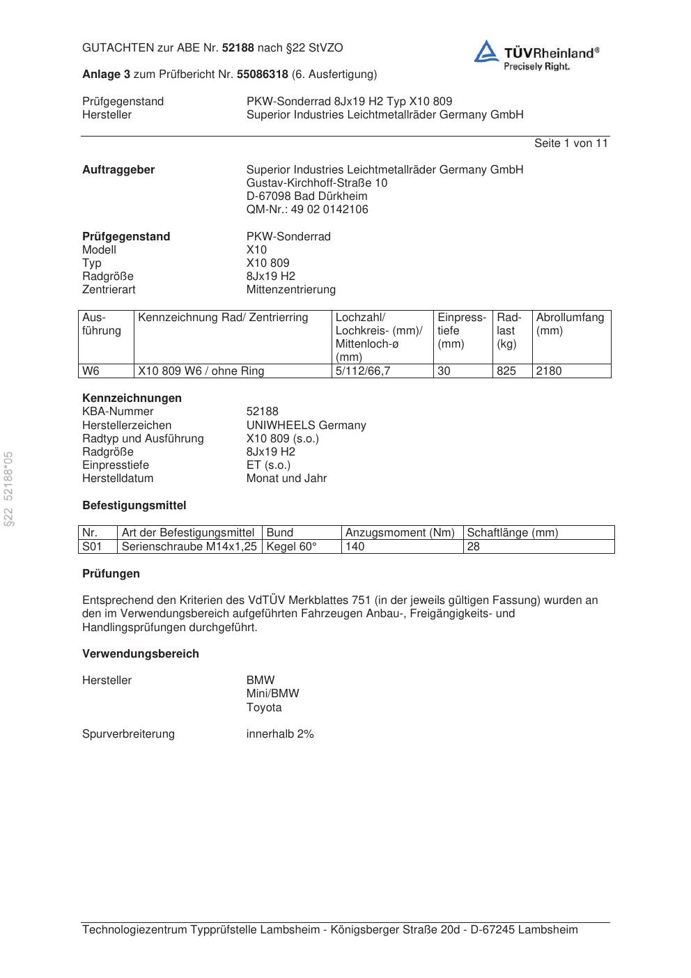 Dieses Gutachten (abe) bezieht sich auf die Alufelge Superior X10 809 in der Ausführung 8Jx19 ET 0, Mittenloch 0 mm (KBA 52188). Im PDF findest du typischerweise zulässige Reifengrößen, Auflagen/Anbauhinweise und – je nach Dokument – Hinweise zur Eintragung.