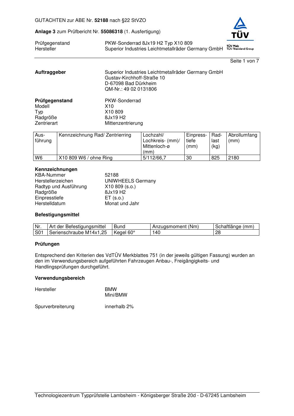 Dieses Gutachten (abe) bezieht sich auf die Alufelge Superior X10 809 in der Ausführung 8Jx19 ET 0, Mittenloch 0 mm (KBA 52188). Im PDF findest du typischerweise zulässige Reifengrößen, Auflagen/Anbauhinweise und – je nach Dokument – Hinweise zur Eintragung.