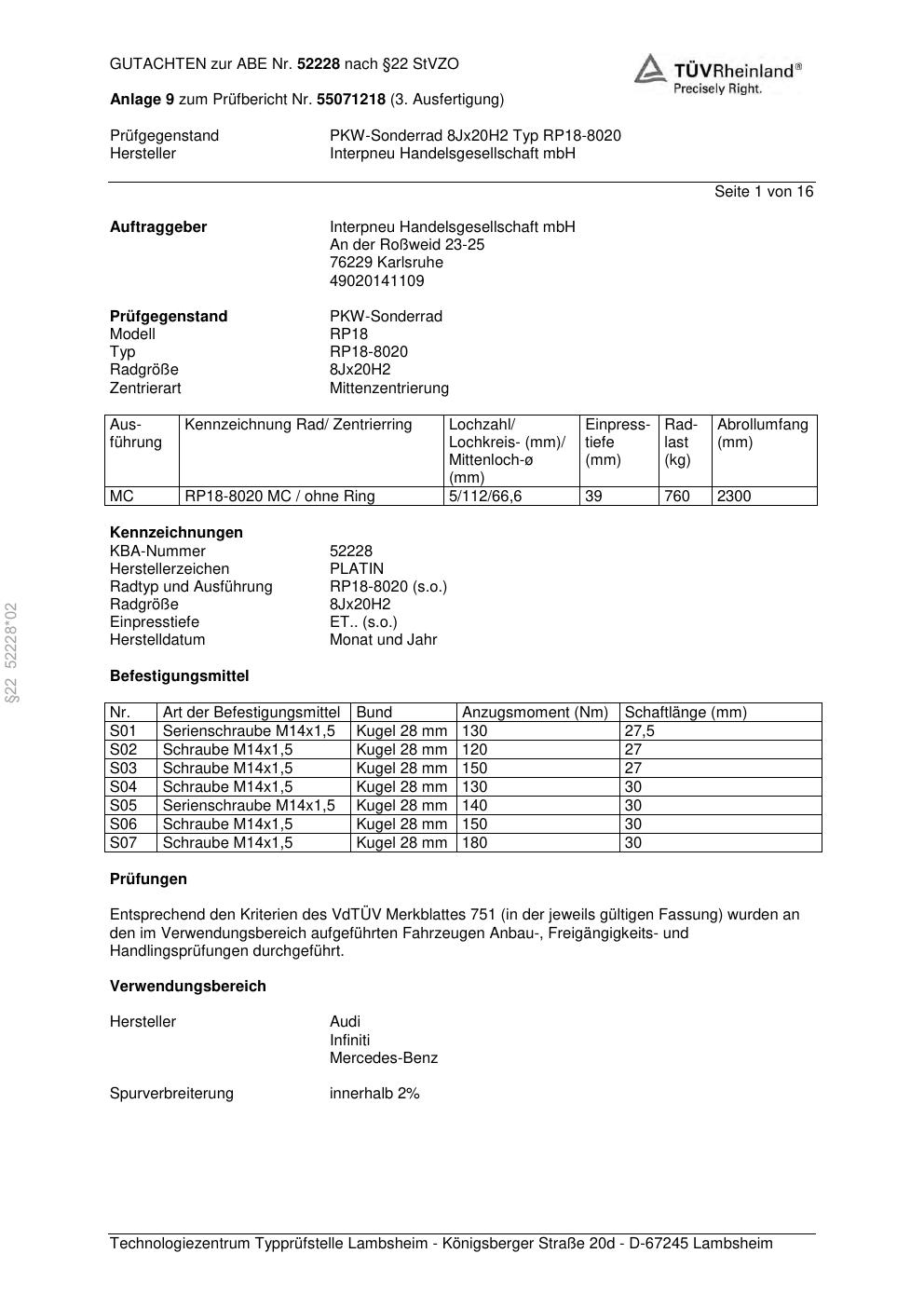 • Stimmt die KBA-Nummer auf der Felge mit diesem Dokument überein?