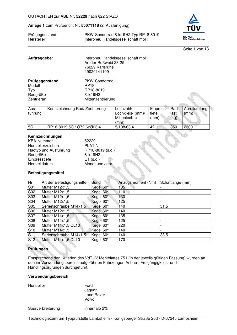 Dieses Gutachten (abe) bezieht sich auf die Alufelge Platin RP18-8019 in der Ausführung 8Jx19 ET 0, Mittenloch 0 mm (KBA 52229). Im PDF findest du typischerweise zulässige Reifengrößen, Auflagen/Anbauhinweise und – je nach Dokument – Hinweise zur Eintragung.