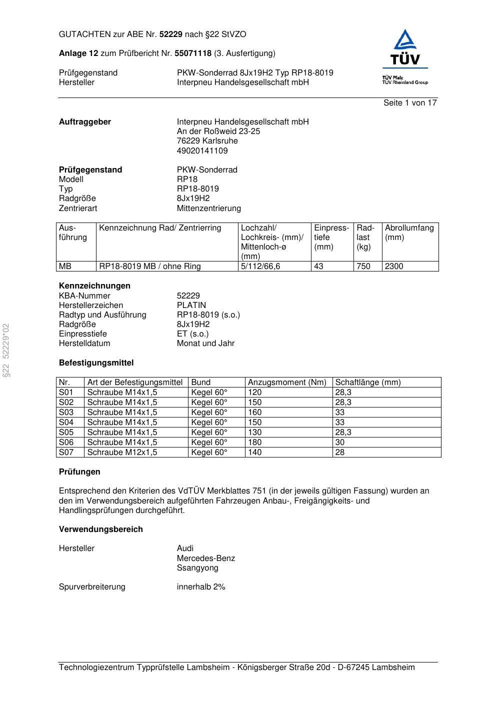 Dieses Gutachten (abe) bezieht sich auf die Alufelge Platin RP18-8019 in der Ausführung 8Jx19 ET 0, Mittenloch 0 mm (KBA 52229). Im PDF findest du typischerweise zulässige Reifengrößen, Auflagen/Anbauhinweise und – je nach Dokument – Hinweise zur Eintragung.