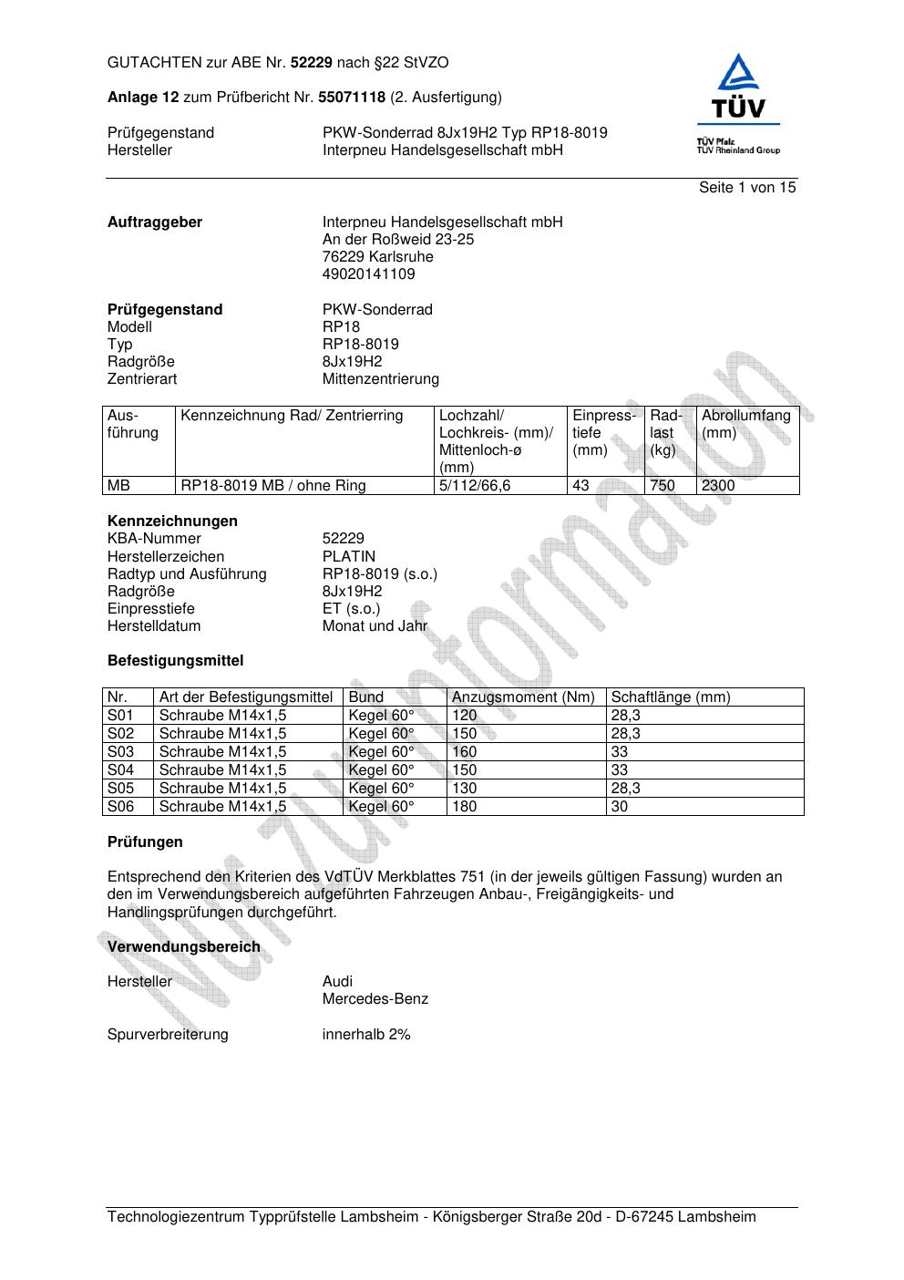 Dieses Gutachten (abe) bezieht sich auf die Alufelge Platin RP18-8019 in der Ausführung 8Jx19 ET 0, Mittenloch 0 mm (KBA 52229). Im PDF findest du typischerweise zulässige Reifengrößen, Auflagen/Anbauhinweise und – je nach Dokument – Hinweise zur Eintragung.