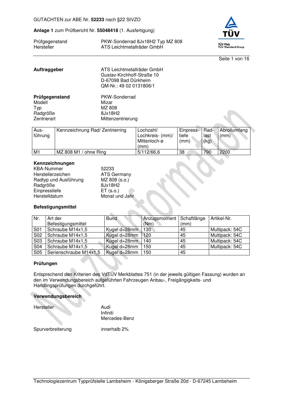 Dieses Gutachten (abe) bezieht sich auf die Alufelge ATS MZ 808 in der Ausführung 8Jx18 ET 0, Mittenloch 0 mm (KBA 52233). Im PDF findest du typischerweise zulässige Reifengrößen, Auflagen/Anbauhinweise und – je nach Dokument – Hinweise zur Eintragung.