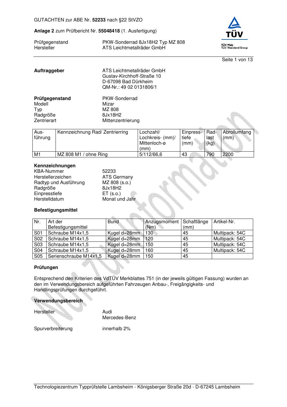 Dieses Gutachten (abe) bezieht sich auf die Alufelge ATS MZ 808 in der Ausführung 8Jx18 ET 0, Mittenloch 0 mm (KBA 52233). Im PDF findest du typischerweise zulässige Reifengrößen, Auflagen/Anbauhinweise und – je nach Dokument – Hinweise zur Eintragung.