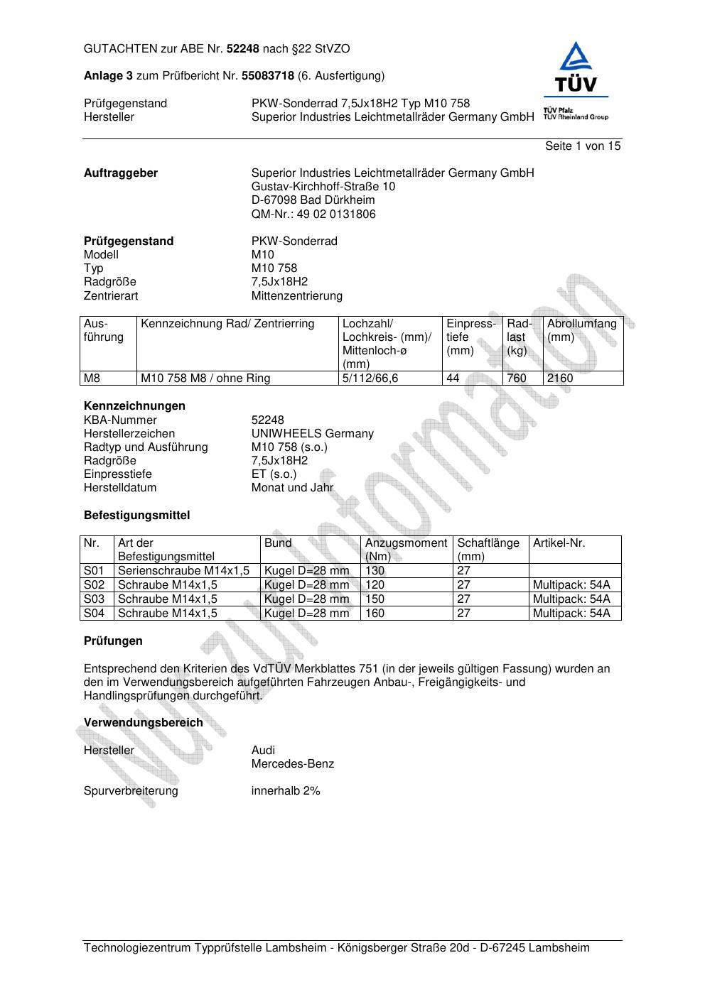 Felgengutachten / abe für Alufelgen Superior M10 758 (7.5Jx18 ET 0, Mittenloch 0 mm) mit KBA 52248 (Zertifikatsnummer 52248). Hier kostenlos als PDF herunterladen. Der Download-Link ist 24 Stunden gültig und kann bis zu zwei Mal verwendet werden.
