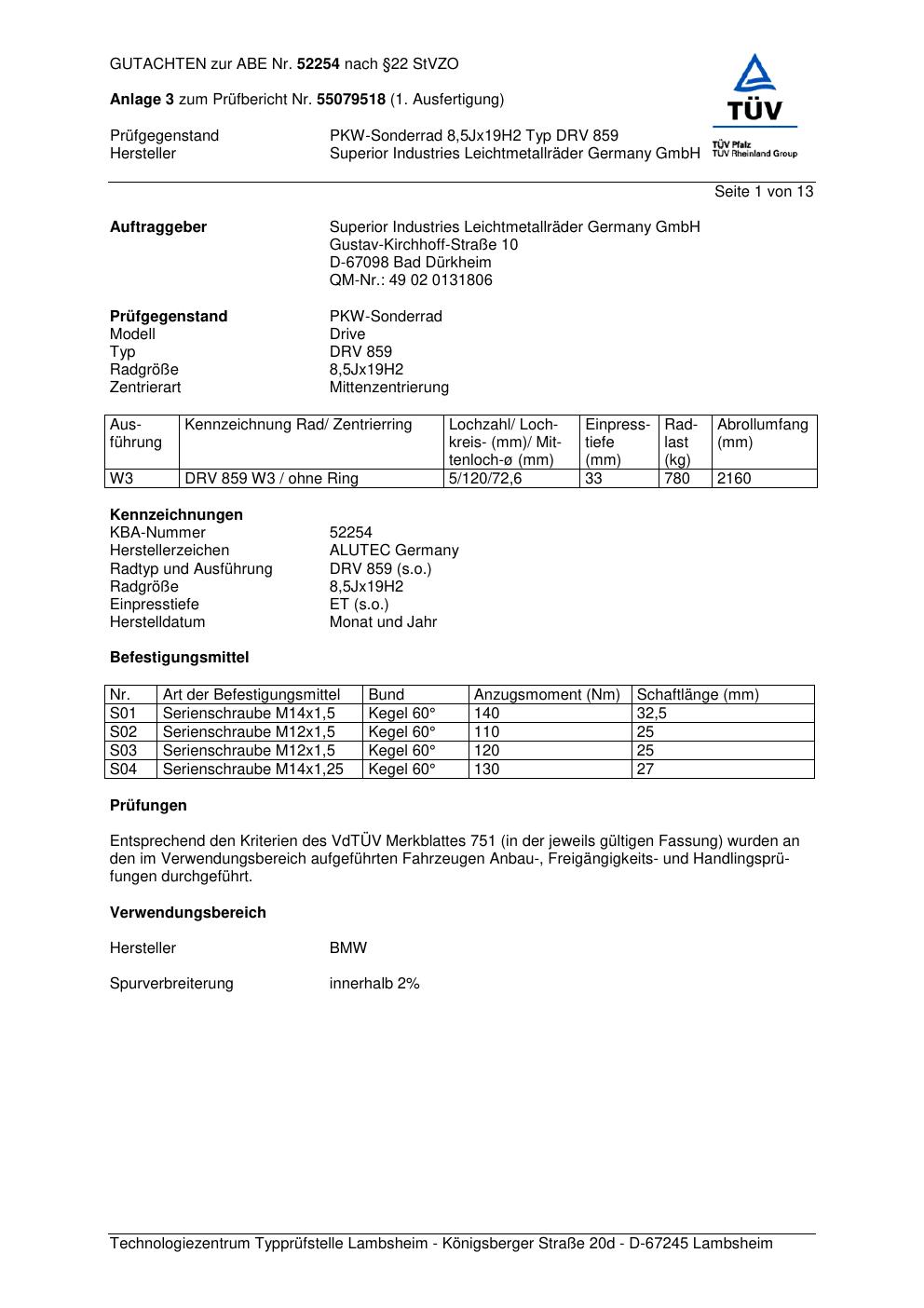 Dieses Gutachten (abe) bezieht sich auf die Alufelge ALUTEC DRV 859 in der Ausführung 8.5Jx19 ET 0, Mittenloch 0 mm (KBA 52254). Im PDF findest du typischerweise zulässige Reifengrößen, Auflagen/Anbauhinweise und – je nach Dokument – Hinweise zur Eintragung.