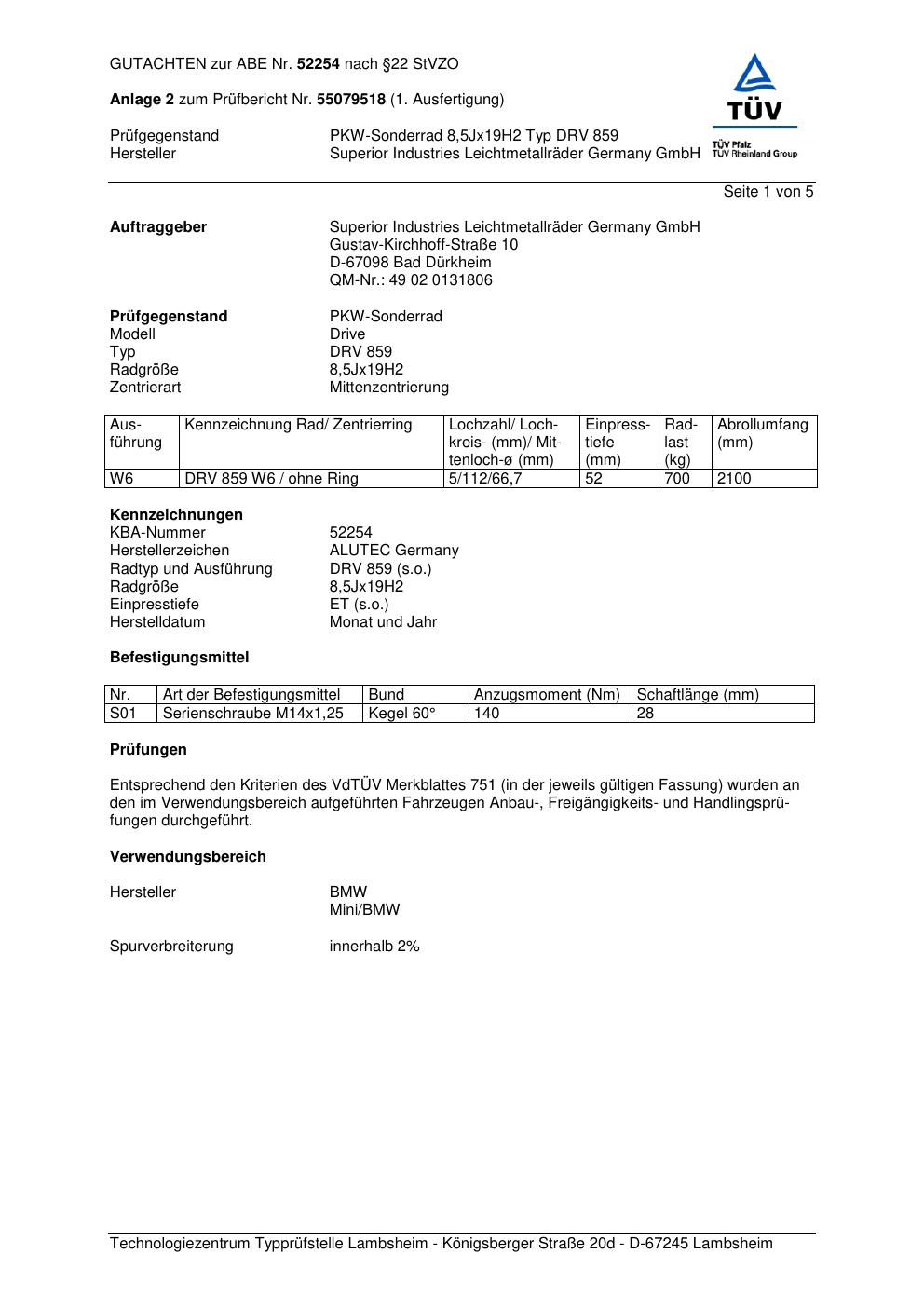 Dieses Gutachten (abe) bezieht sich auf die Alufelge ALUTEC DRV 859 in der Ausführung 8.5Jx19 ET 0, Mittenloch 0 mm (KBA 52254). Im PDF findest du typischerweise zulässige Reifengrößen, Auflagen/Anbauhinweise und – je nach Dokument – Hinweise zur Eintragung.