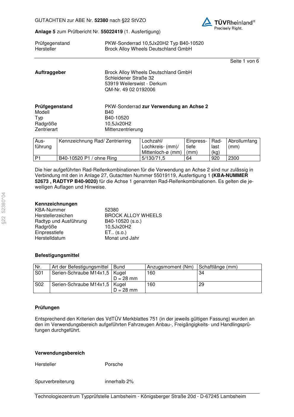 Dieses Gutachten (abe) bezieht sich auf die Alufelge Brock B40-105 20 in der Ausführung 10.5Jx2 ET 0, Mittenloch 0 mm (KBA 52380). Im PDF findest du typischerweise zulässige Reifengrößen, Auflagen/Anbauhinweise und – je nach Dokument – Hinweise zur Eintragung.