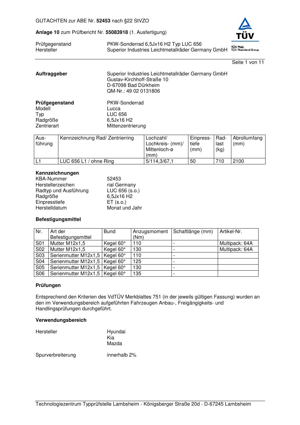 Dieses Gutachten (abe) bezieht sich auf die Alufelge brand-rial LUC 656 in der Ausführung 6.5Jx16 ET 0, Mittenloch 0 mm (KBA 52453). Im PDF findest du typischerweise zulässige Reifengrößen, Auflagen/Anbauhinweise und – je nach Dokument – Hinweise zur Eintragung.