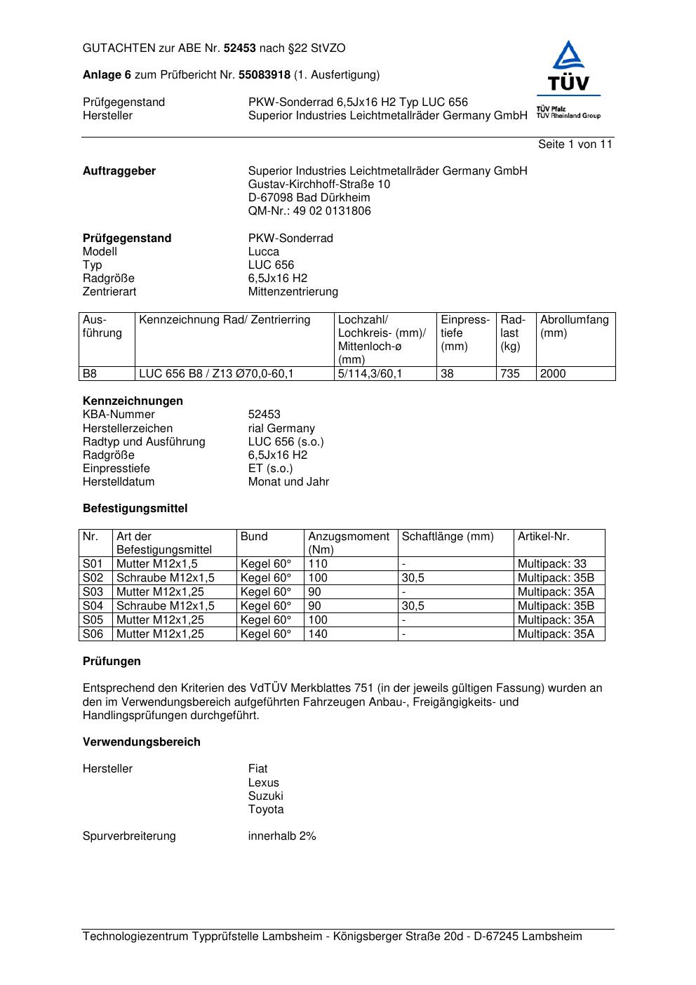 Dieses Gutachten (abe) bezieht sich auf die Alufelge brand-rial LUC 656 in der Ausführung 6.5Jx16 ET 0, Mittenloch 0 mm (KBA 52453). Im PDF findest du typischerweise zulässige Reifengrößen, Auflagen/Anbauhinweise und – je nach Dokument – Hinweise zur Eintragung.