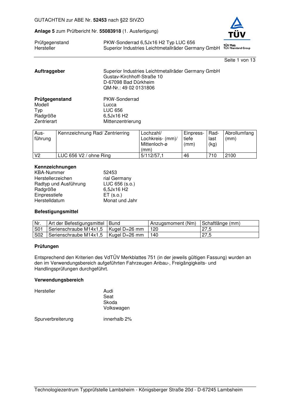 Dieses Gutachten (abe) bezieht sich auf die Alufelge brand-rial LUC 656 in der Ausführung 6.5Jx16 ET 0, Mittenloch 0 mm (KBA 52453). Im PDF findest du typischerweise zulässige Reifengrößen, Auflagen/Anbauhinweise und – je nach Dokument – Hinweise zur Eintragung.
