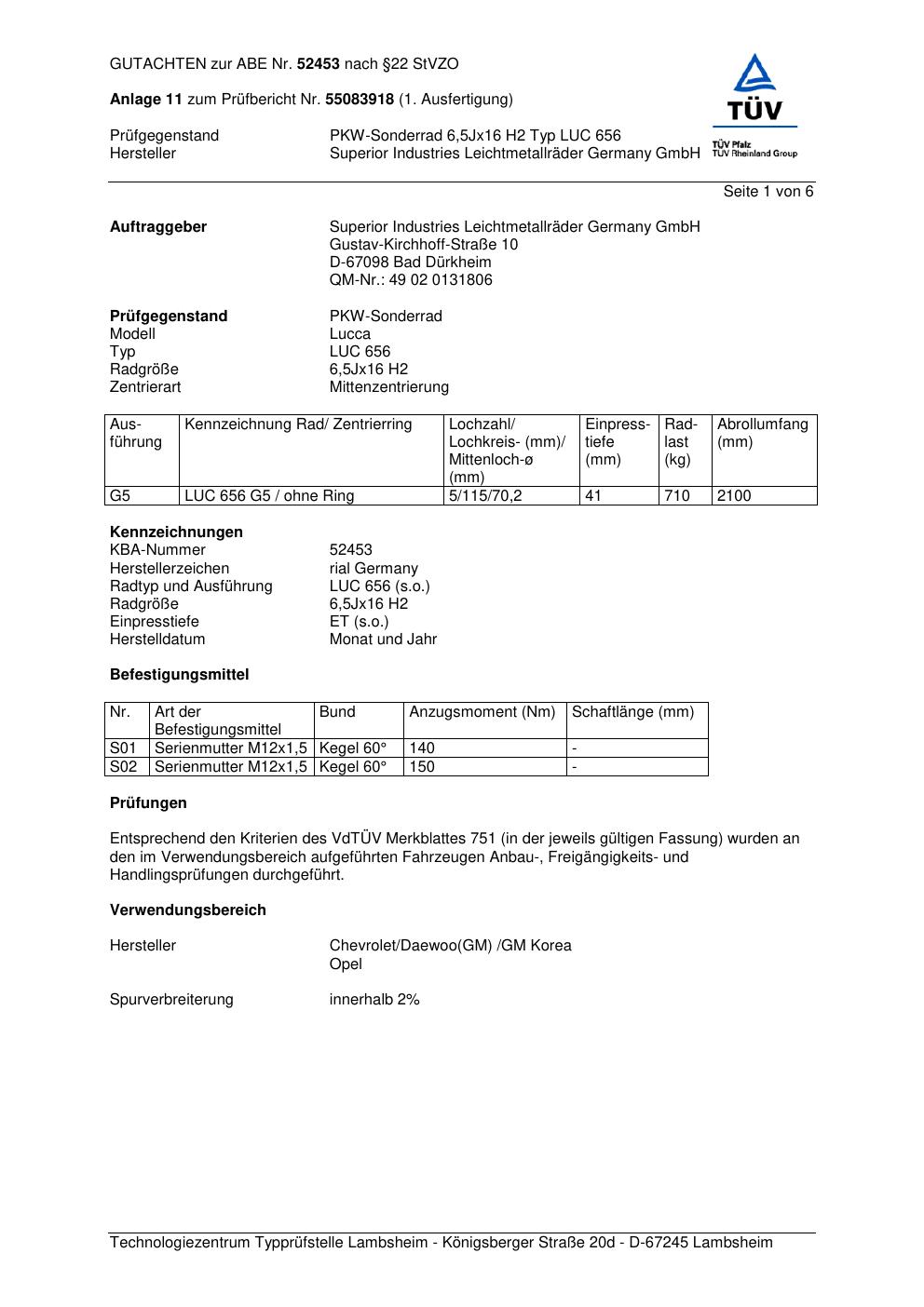 Dieses Gutachten (abe) bezieht sich auf die Alufelge brand-rial LUC 656 in der Ausführung 6.5Jx16 ET 0, Mittenloch 0 mm (KBA 52453). Im PDF findest du typischerweise zulässige Reifengrößen, Auflagen/Anbauhinweise und – je nach Dokument – Hinweise zur Eintragung.