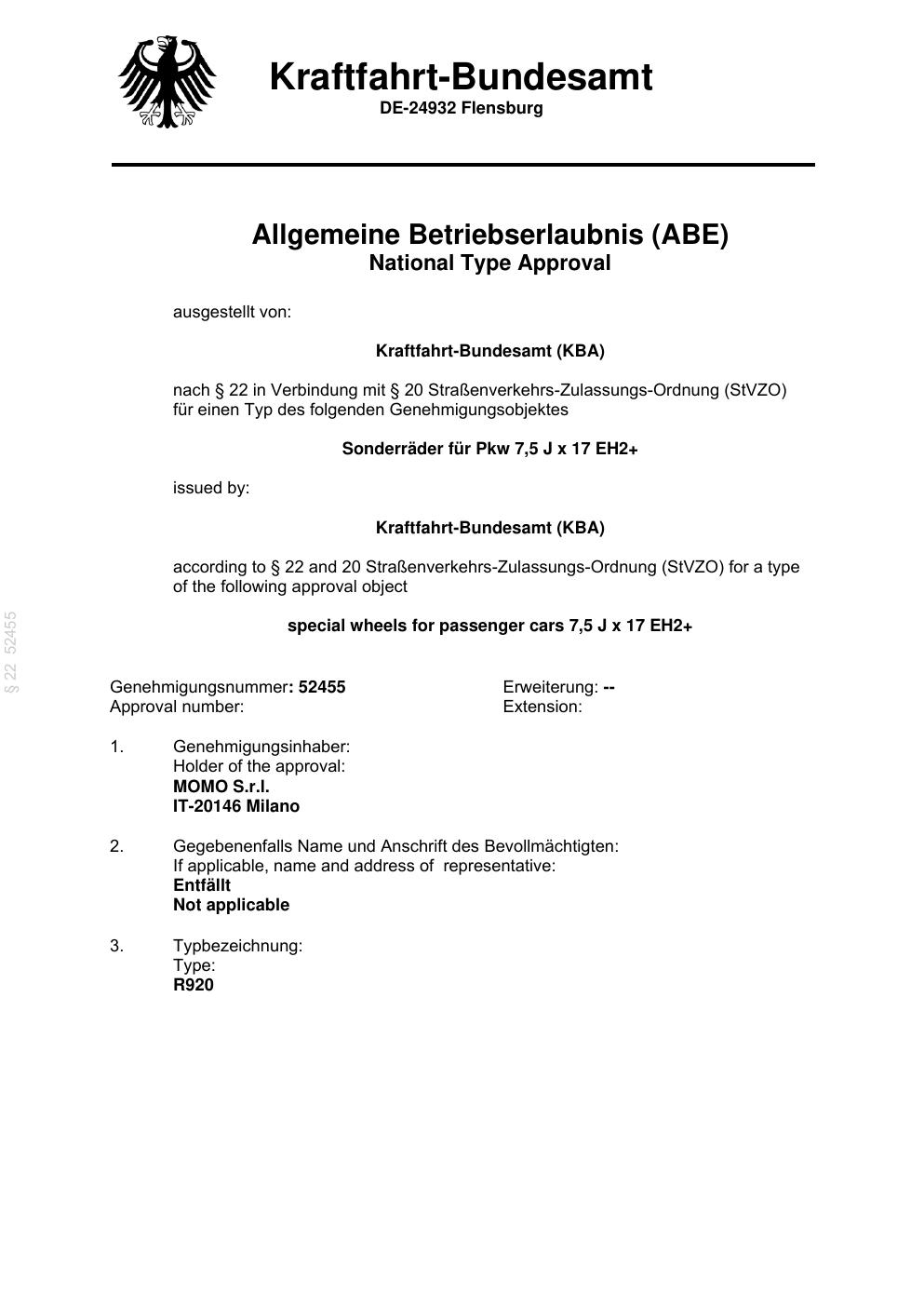 Dieses Gutachten (abe) bezieht sich auf die Alufelge Momo RFX013-105 in der Ausführung 7.5Jx17 ET 0, Mittenloch 0 mm (KBA 52455). Im PDF findest du typischerweise zulässige Reifengrößen, Auflagen/Anbauhinweise und – je nach Dokument – Hinweise zur Eintragung.