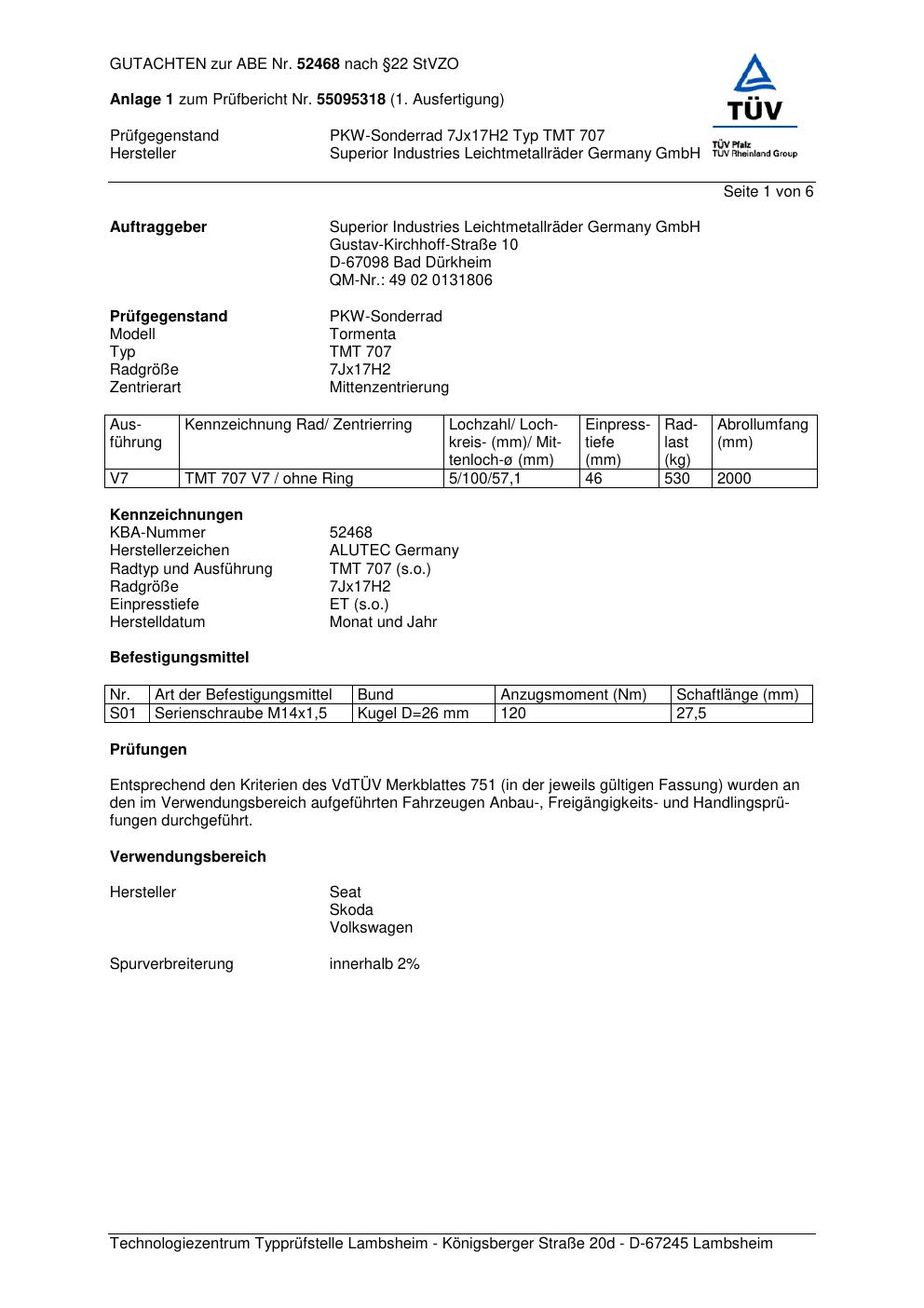 Dieses Gutachten (abe) bezieht sich auf die Alufelge ALUTEC TMT 707 in der Ausführung 7Jx17 ET 0, Mittenloch 0 mm (KBA 52468). Im PDF findest du typischerweise zulässige Reifengrößen, Auflagen/Anbauhinweise und – je nach Dokument – Hinweise zur Eintragung.