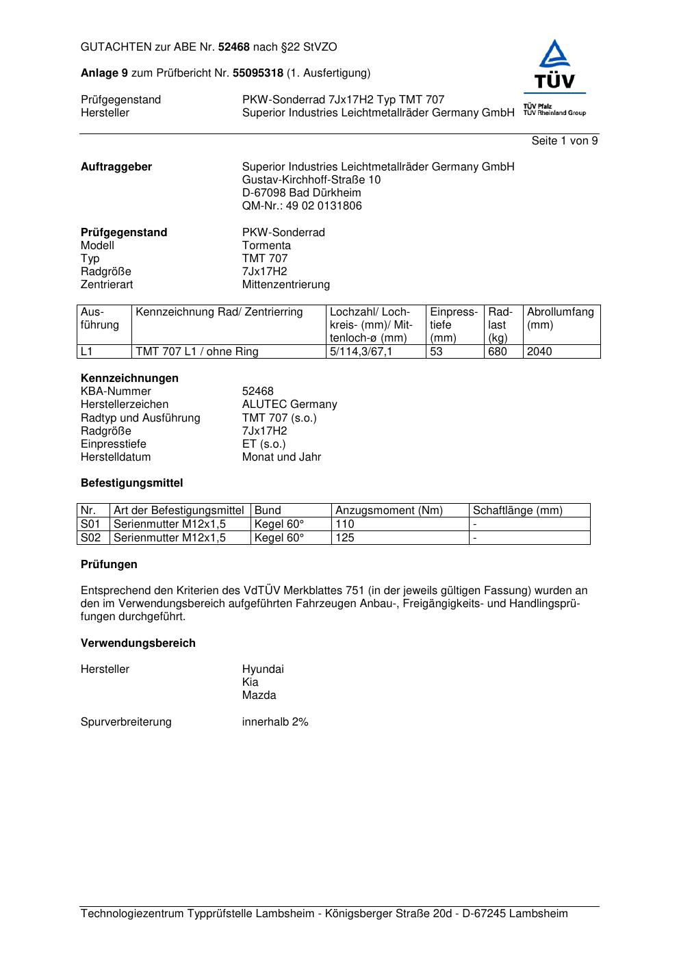 Dieses Gutachten (abe) bezieht sich auf die Alufelge ALUTEC TMT 707 in der Ausführung 7Jx17 ET 0, Mittenloch 0 mm (KBA 52468). Im PDF findest du typischerweise zulässige Reifengrößen, Auflagen/Anbauhinweise und – je nach Dokument – Hinweise zur Eintragung.