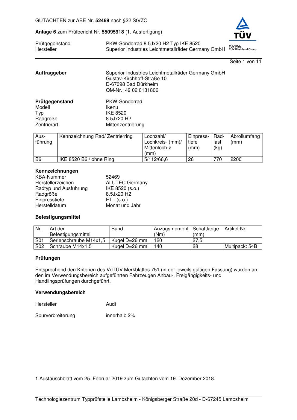 Dieses Gutachten (abe) bezieht sich auf die Alufelge ALUTEC IKE 852 0 in der Ausführung 8.5Jx2 ET 0, Mittenloch 0 mm (KBA 52469). Im PDF findest du typischerweise zulässige Reifengrößen, Auflagen/Anbauhinweise und – je nach Dokument – Hinweise zur Eintragung.