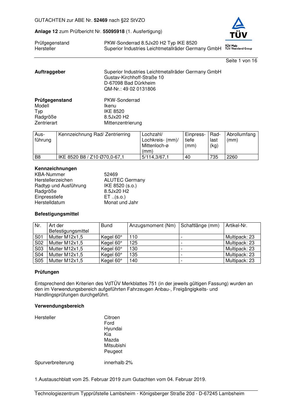 Dieses Gutachten (abe) bezieht sich auf die Alufelge ALUTEC IKE 852 0 in der Ausführung 8.5Jx2 ET 0, Mittenloch 0 mm (KBA 52469). Im PDF findest du typischerweise zulässige Reifengrößen, Auflagen/Anbauhinweise und – je nach Dokument – Hinweise zur Eintragung.