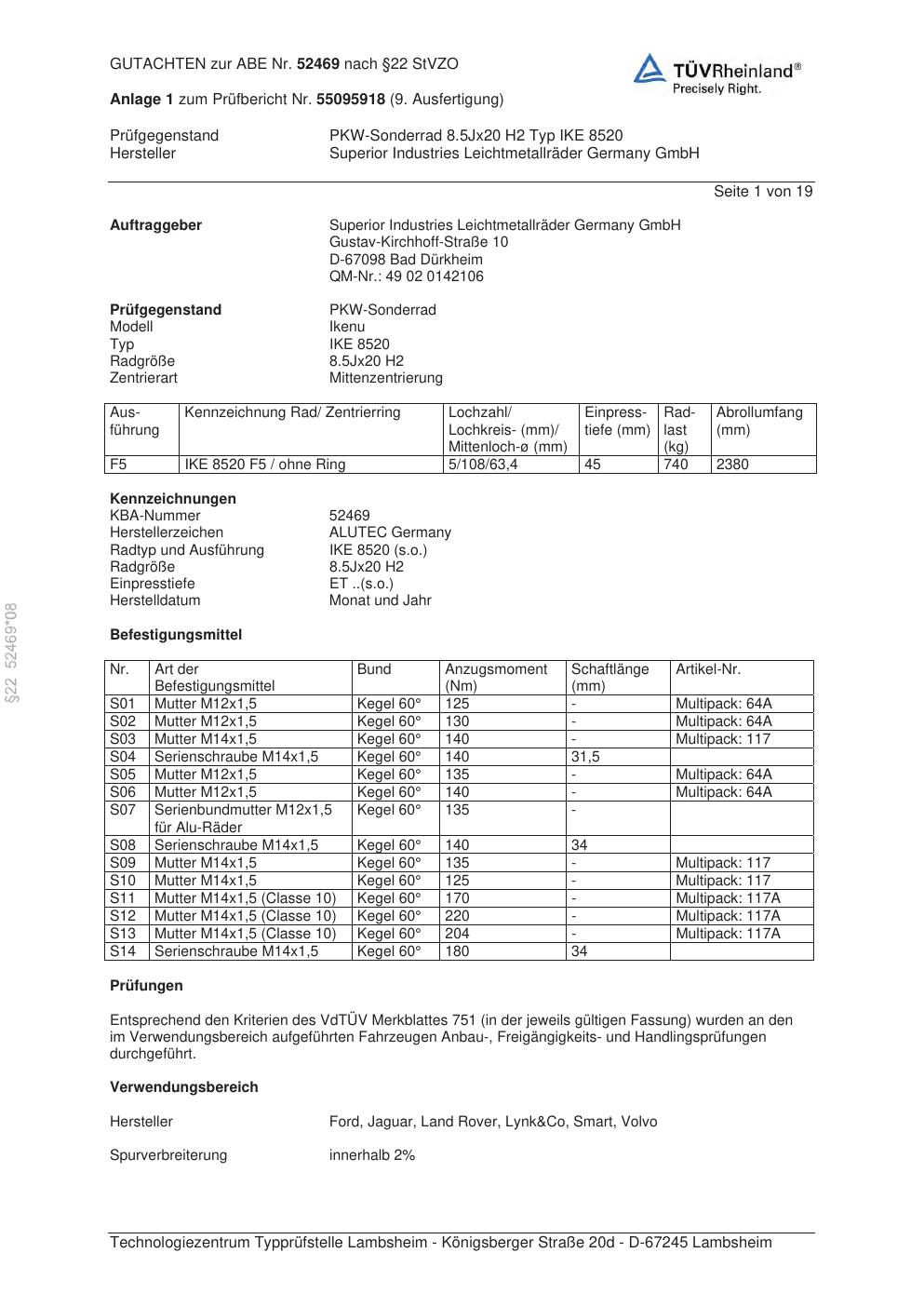 Felgengutachten / abe für Alufelgen ALUTEC IKE 8520 (8.5Jx2 ET 0, Mittenloch 0 mm) mit KBA 52469 (Zertifikatsnummer 52469). Hier kostenlos als PDF herunterladen. Der Download-Link ist 24 Stunden gültig und kann bis zu zwei Mal verwendet werden.