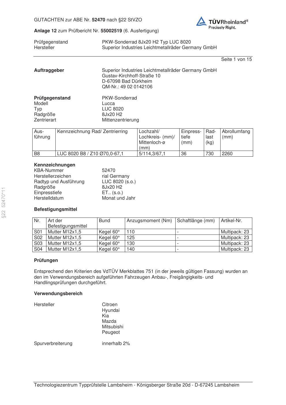 Dieses Gutachten (abe) bezieht sich auf die Alufelge brand-rial LUC 8020 in der Ausführung 8Jx2 ET 0, Mittenloch 0 mm (KBA 52470). Im PDF findest du typischerweise zulässige Reifengrößen, Auflagen/Anbauhinweise und – je nach Dokument – Hinweise zur Eintragung.