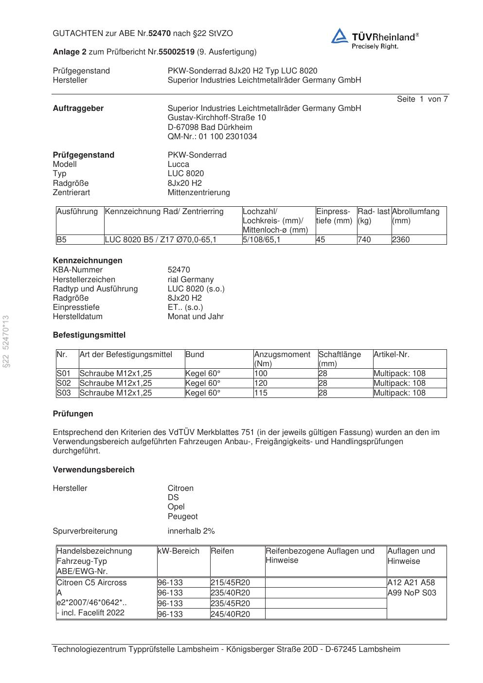 Dieses Gutachten (abe) bezieht sich auf die Alufelge brand-rial LUC 8020 in der Ausführung 8Jx2 ET 0, Mittenloch 0 mm (KBA 52470). Im PDF findest du typischerweise zulässige Reifengrößen, Auflagen/Anbauhinweise und – je nach Dokument – Hinweise zur Eintragung.