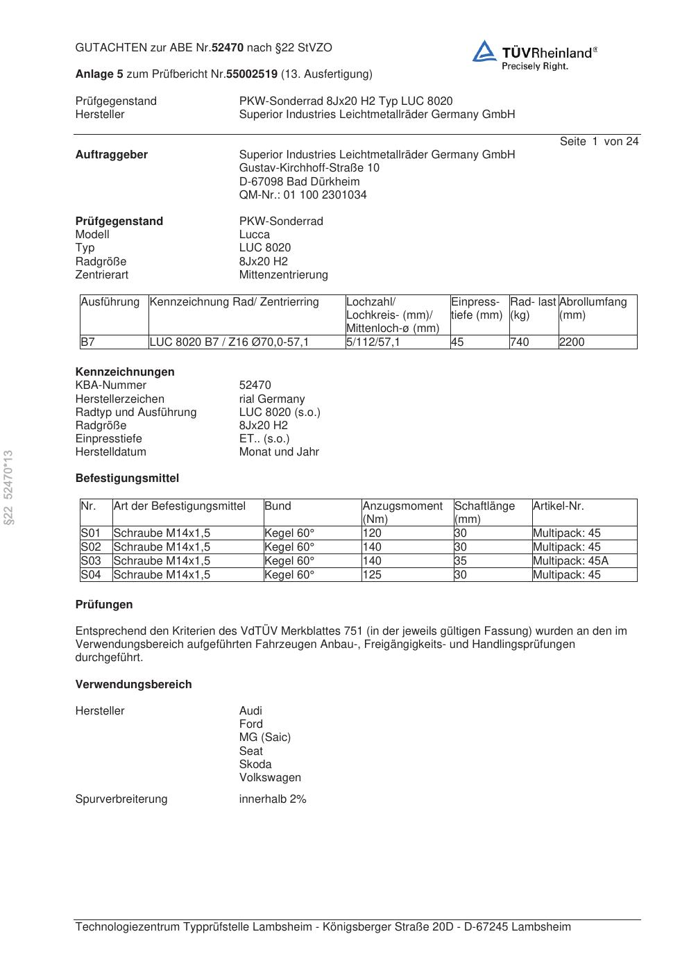 Dieses Gutachten (abe) bezieht sich auf die Alufelge brand-rial LUC 8020 in der Ausführung 8Jx2 ET 0, Mittenloch 0 mm (KBA 52470). Im PDF findest du typischerweise zulässige Reifengrößen, Auflagen/Anbauhinweise und – je nach Dokument – Hinweise zur Eintragung.