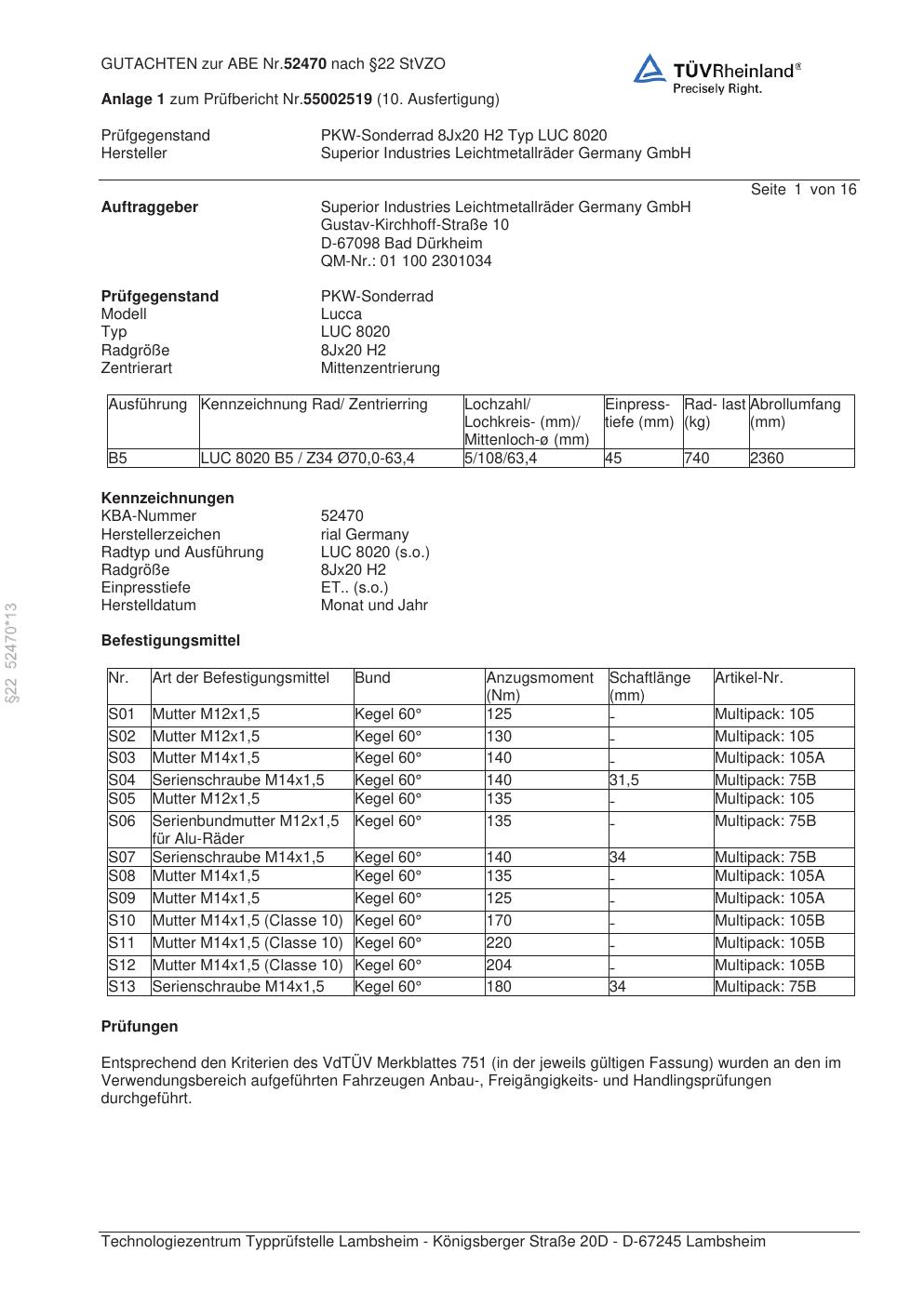 Dieses Gutachten (abe) bezieht sich auf die Alufelge brand-rial LUC 8020 in der Ausführung 8Jx2 ET 0, Mittenloch 0 mm (KBA 52470). Im PDF findest du typischerweise zulässige Reifengrößen, Auflagen/Anbauhinweise und – je nach Dokument – Hinweise zur Eintragung.