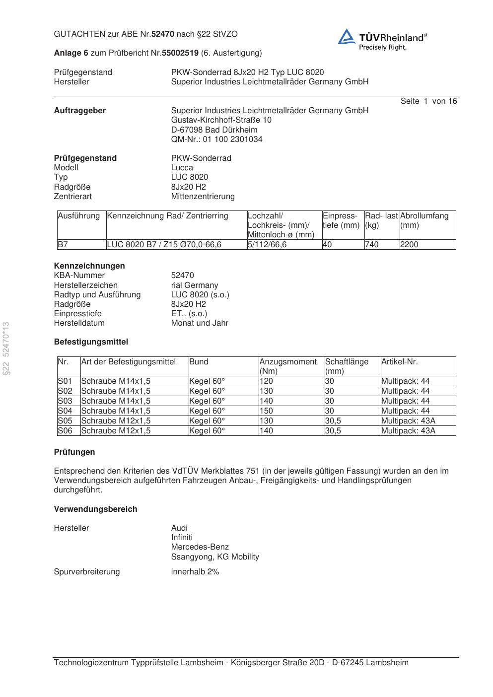 Felgengutachten / abe für Alufelgen Rial LUC 8020 (8Jx2 ET 0, Mittenloch 0 mm) mit KBA 52470 (Zertifikatsnummer 52470). Hier kostenlos als PDF herunterladen. Der Download-Link ist 24 Stunden gültig und kann bis zu zwei Mal verwendet werden.