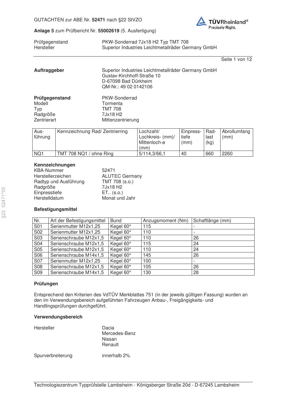 Dieses Gutachten (abe) bezieht sich auf die Alufelge ALUTEC TMT 708 in der Ausführung 7Jx18 ET 0, Mittenloch 0 mm (KBA 52471). Im PDF findest du typischerweise zulässige Reifengrößen, Auflagen/Anbauhinweise und – je nach Dokument – Hinweise zur Eintragung.