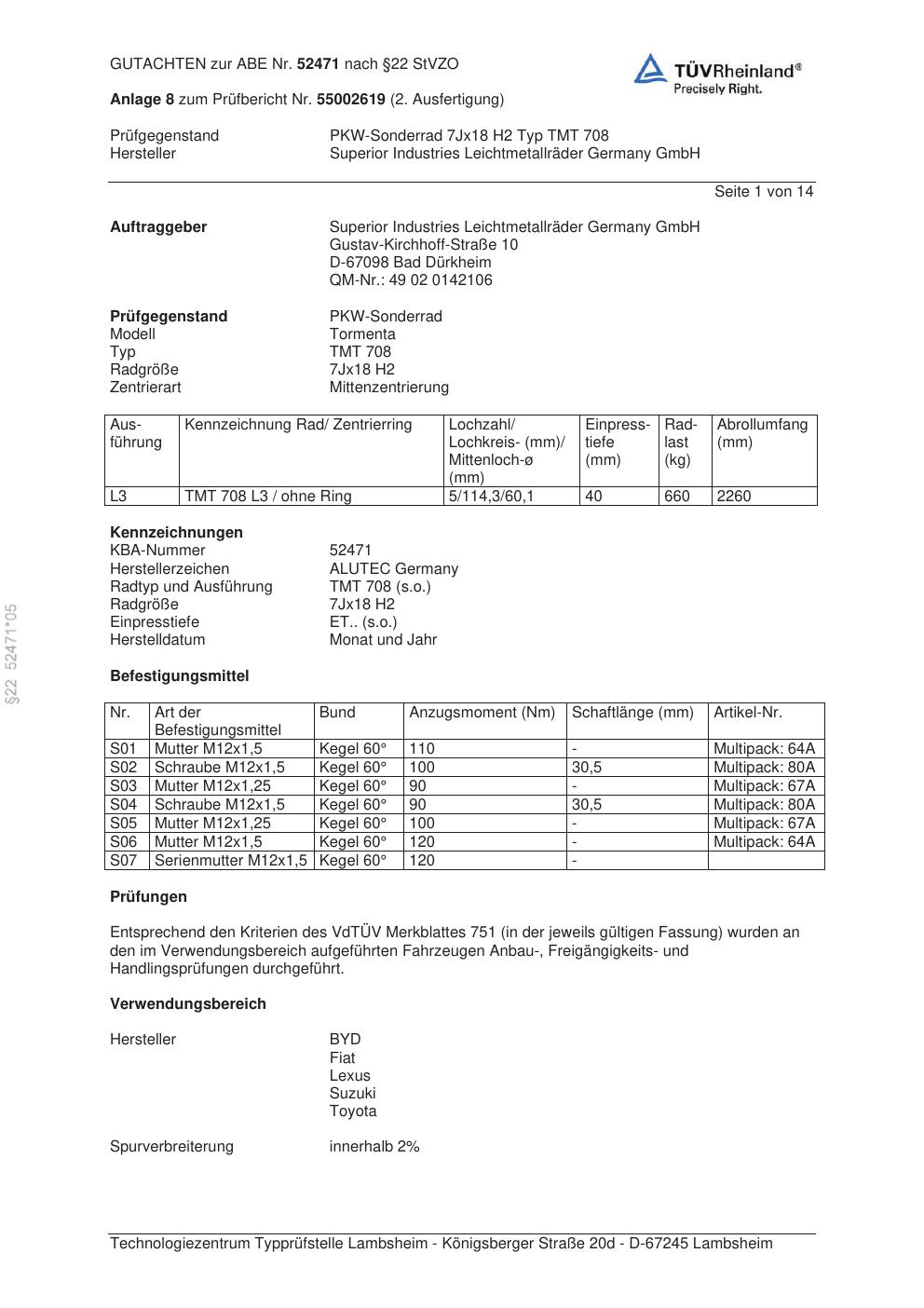 Dieses Gutachten (abe) bezieht sich auf die Alufelge ALUTEC TMT 708 in der Ausführung 7Jx18 ET 0, Mittenloch 0 mm (KBA 52471). Im PDF findest du typischerweise zulässige Reifengrößen, Auflagen/Anbauhinweise und – je nach Dokument – Hinweise zur Eintragung.