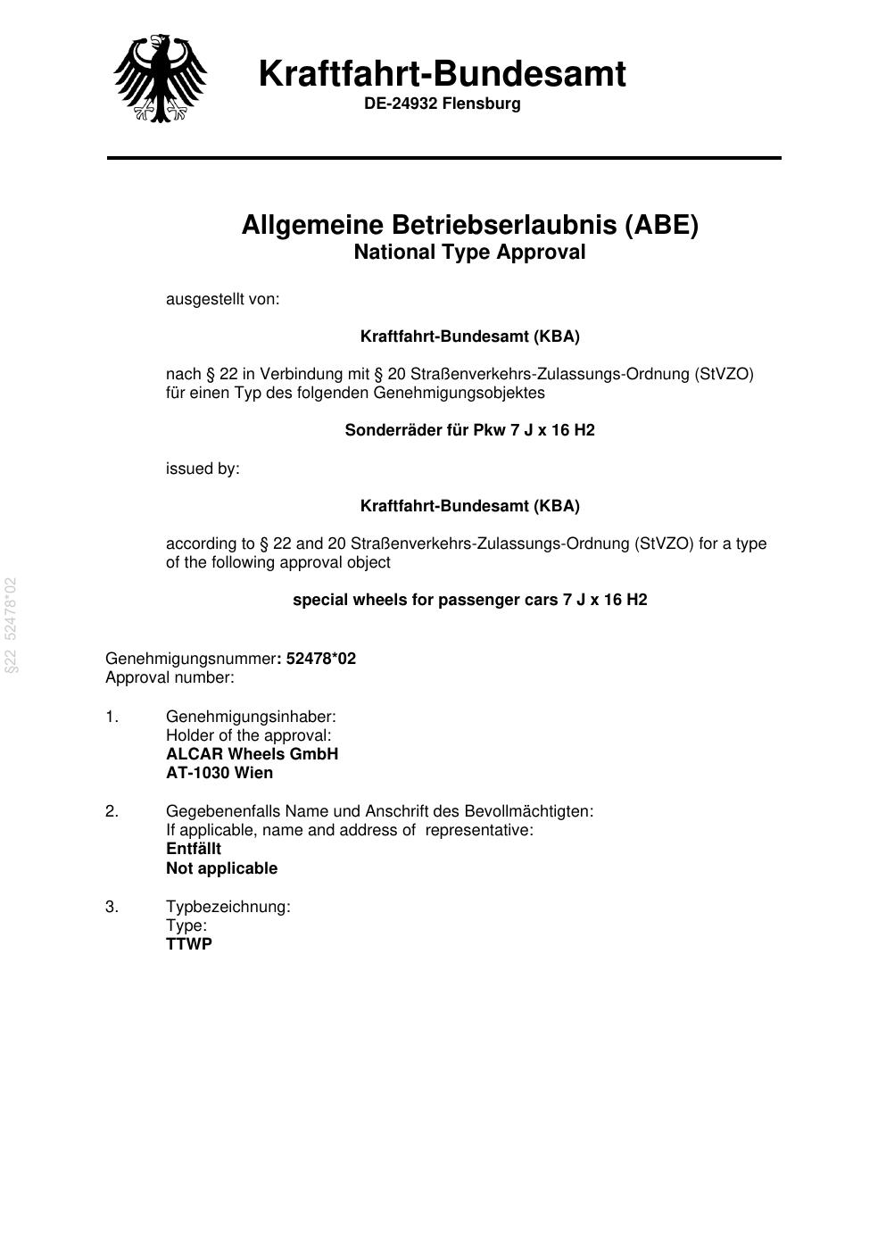 Dieses Gutachten (abe) bezieht sich auf die Alufelge ATS UN8080 in der Ausführung 7Jx16 ET 0, Mittenloch 0 mm (KBA 52478). Im PDF findest du typischerweise zulässige Reifengrößen, Auflagen/Anbauhinweise und – je nach Dokument – Hinweise zur Eintragung.