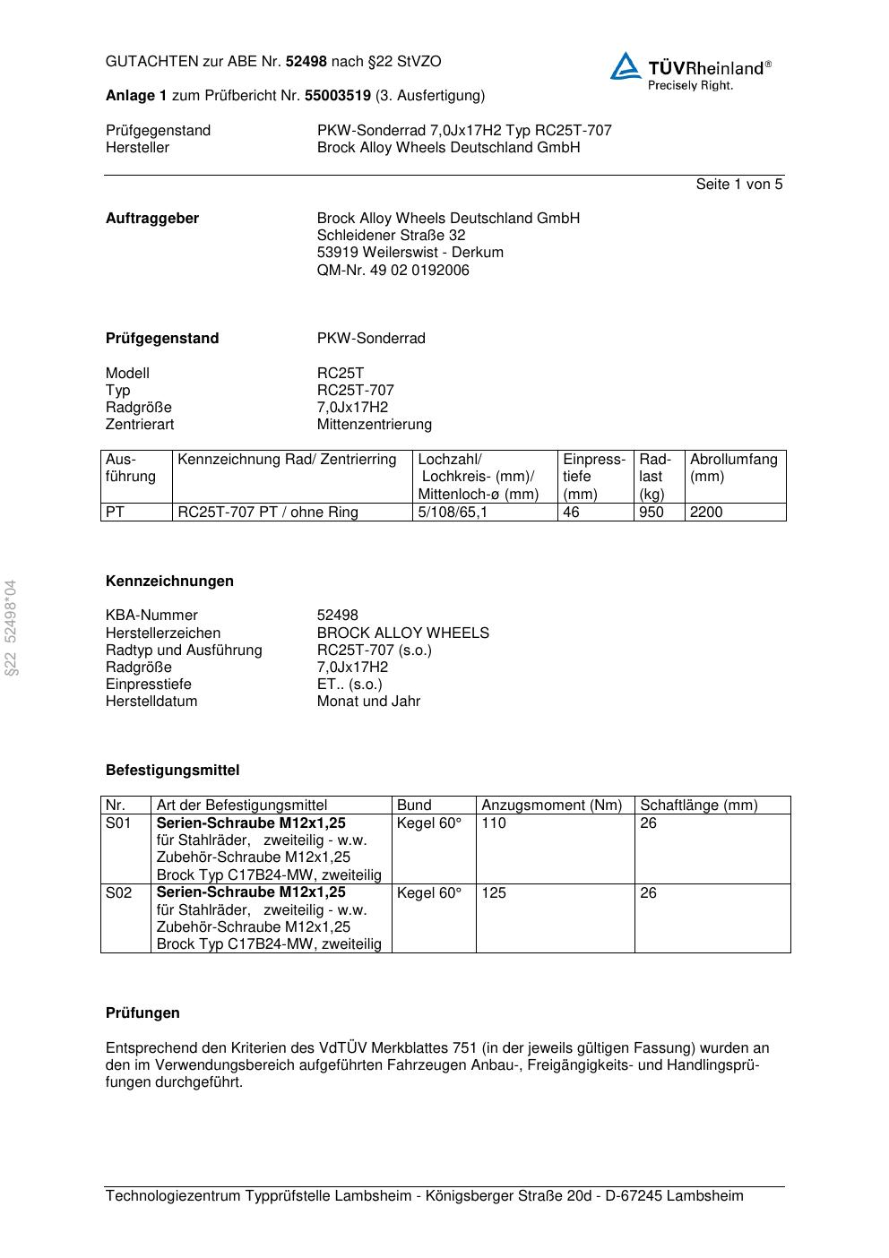 Dieses Gutachten (abe) bezieht sich auf die Alufelge Brock RC25T-70 7 in der Ausführung 7Jx17 ET 0, Mittenloch 0 mm (KBA 52498). Im PDF findest du typischerweise zulässige Reifengrößen, Auflagen/Anbauhinweise und – je nach Dokument – Hinweise zur Eintragung.
