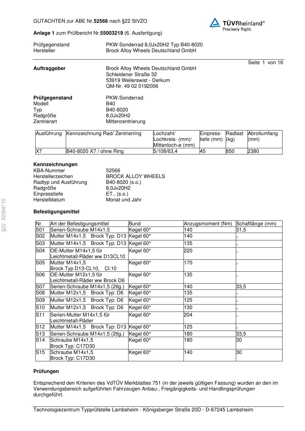 Felgengutachten / abe für Alufelgen Brock B40-8020 (8Jx2 ET 0, Mittenloch 0 mm) mit KBA 52566 (Zertifikatsnummer 52566). Hier kostenlos als PDF herunterladen. Der Download-Link ist 24 Stunden gültig und kann bis zu zwei Mal verwendet werden.