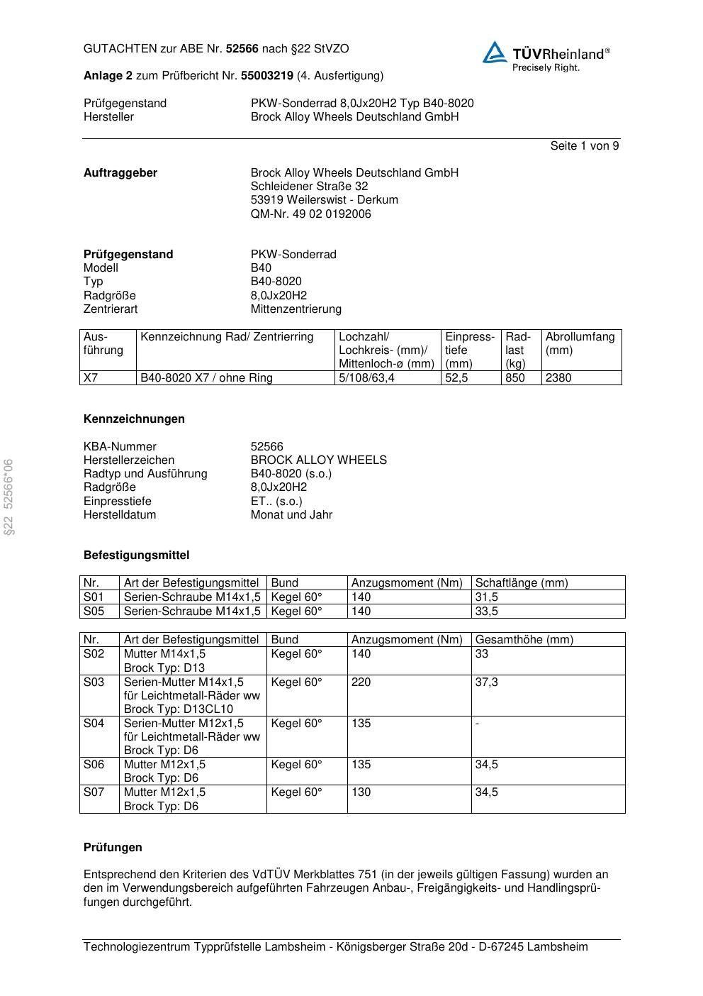 Felgengutachten / abe für Alufelgen Brock B40-8020 (8Jx2 ET 0, Mittenloch 0 mm) mit KBA 52566 (Zertifikatsnummer 52566). Hier kostenlos als PDF herunterladen. Der Download-Link ist 24 Stunden gültig und kann bis zu zwei Mal verwendet werden.
