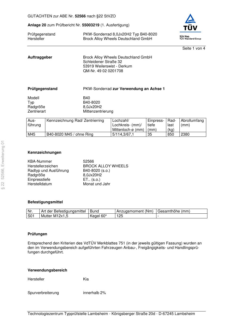 Dieses Gutachten (abe) bezieht sich auf die Alufelge Brock B40-8020 in der Ausführung 8Jx2 ET 0, Mittenloch 0 mm (KBA 52566). Im PDF findest du typischerweise zulässige Reifengrößen, Auflagen/Anbauhinweise und – je nach Dokument – Hinweise zur Eintragung.