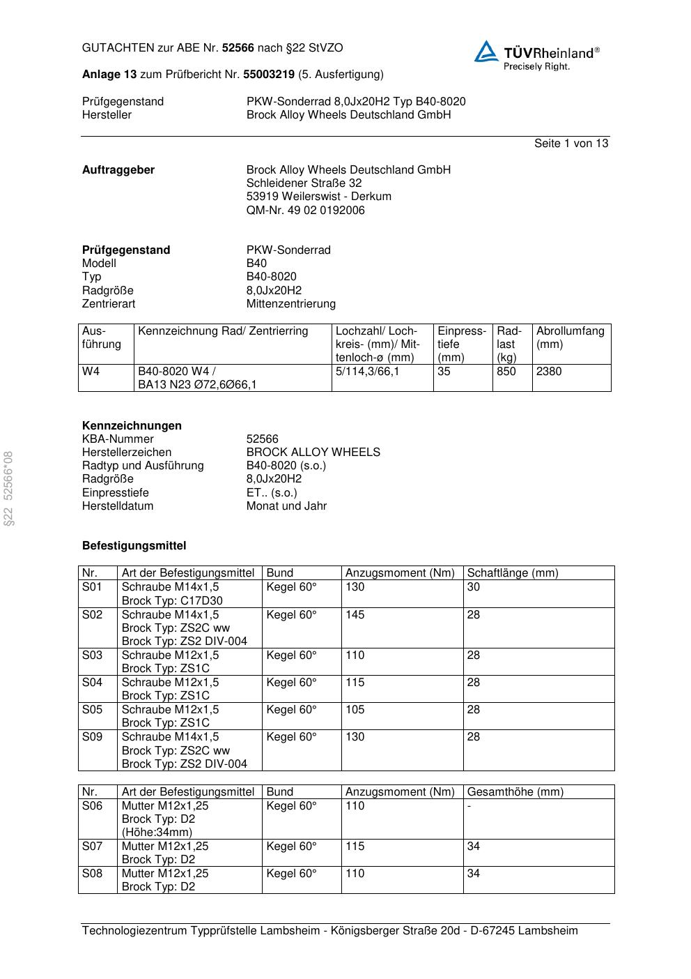 Felgengutachten / abe für Alufelgen Brock B40-8020 (8Jx2 ET 0, Mittenloch 0 mm) mit KBA 52566 (Zertifikatsnummer 52566). Hier kostenlos als PDF herunterladen. Der Download-Link ist 24 Stunden gültig und kann bis zu zwei Mal verwendet werden.
