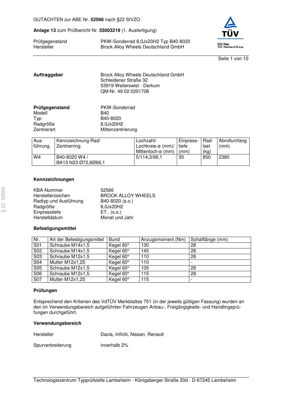 Felgengutachten / abe für Alufelgen Brock B40-8020 (8Jx2 ET 0, Mittenloch 0 mm) mit KBA 52566 (Zertifikatsnummer 52566). Hier kostenlos als PDF herunterladen. Der Download-Link ist 24 Stunden gültig und kann bis zu zwei Mal verwendet werden.