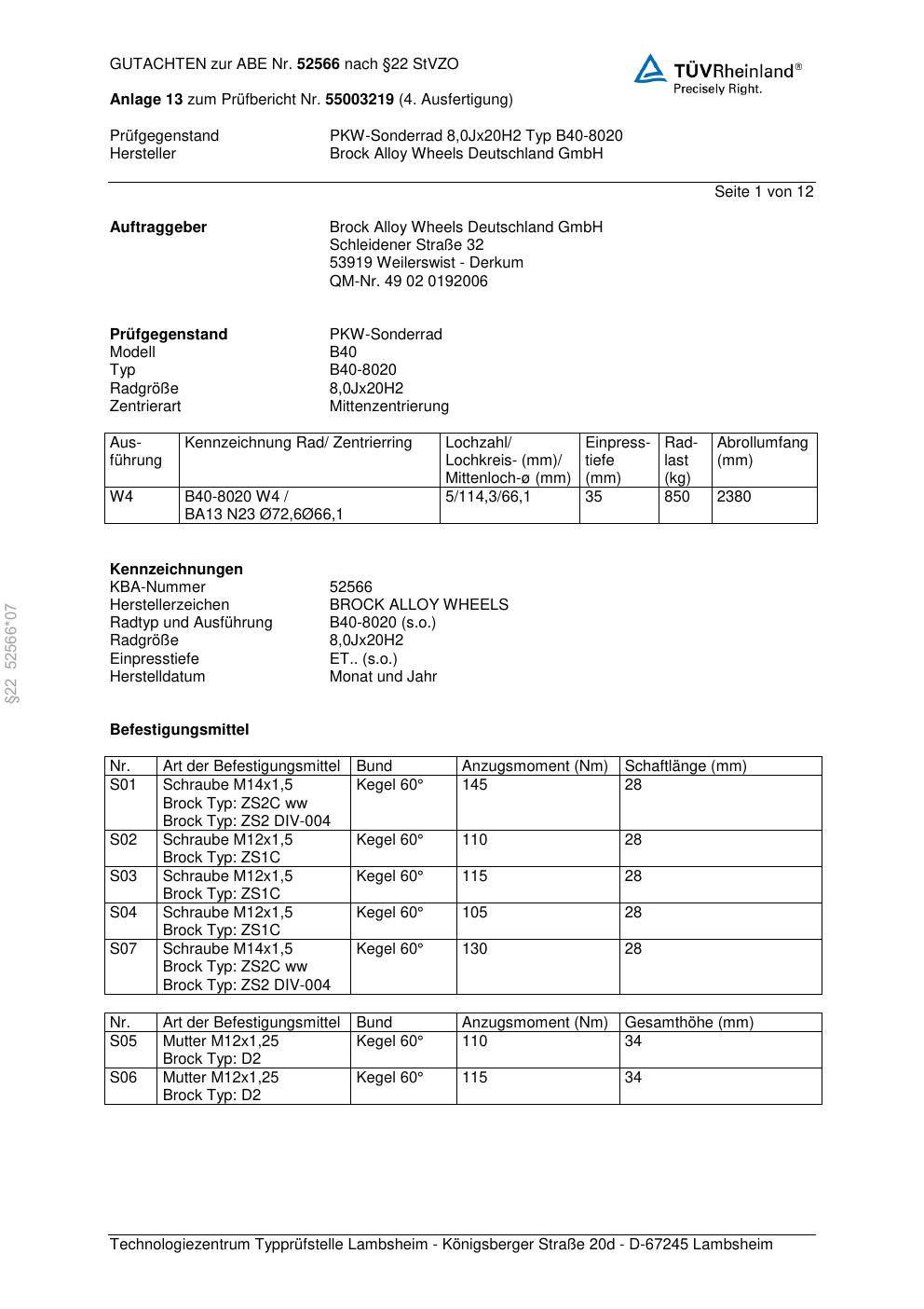 Felgengutachten / abe für Alufelgen Brock B40-8020 (8Jx2 ET 0, Mittenloch 0 mm) mit KBA 52566 (Zertifikatsnummer 52566). Hier kostenlos als PDF herunterladen. Der Download-Link ist 24 Stunden gültig und kann bis zu zwei Mal verwendet werden.