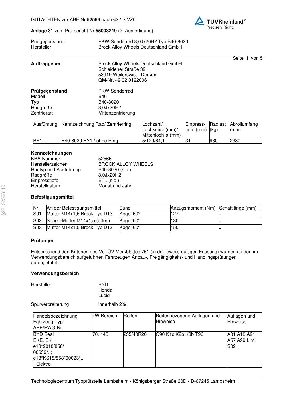 Felgengutachten / abe für Alufelgen Brock B40-8020 (8Jx2 ET 0, Mittenloch 0 mm) mit KBA 52566 (Zertifikatsnummer 52566). Hier kostenlos als PDF herunterladen. Der Download-Link ist 24 Stunden gültig und kann bis zu zwei Mal verwendet werden.