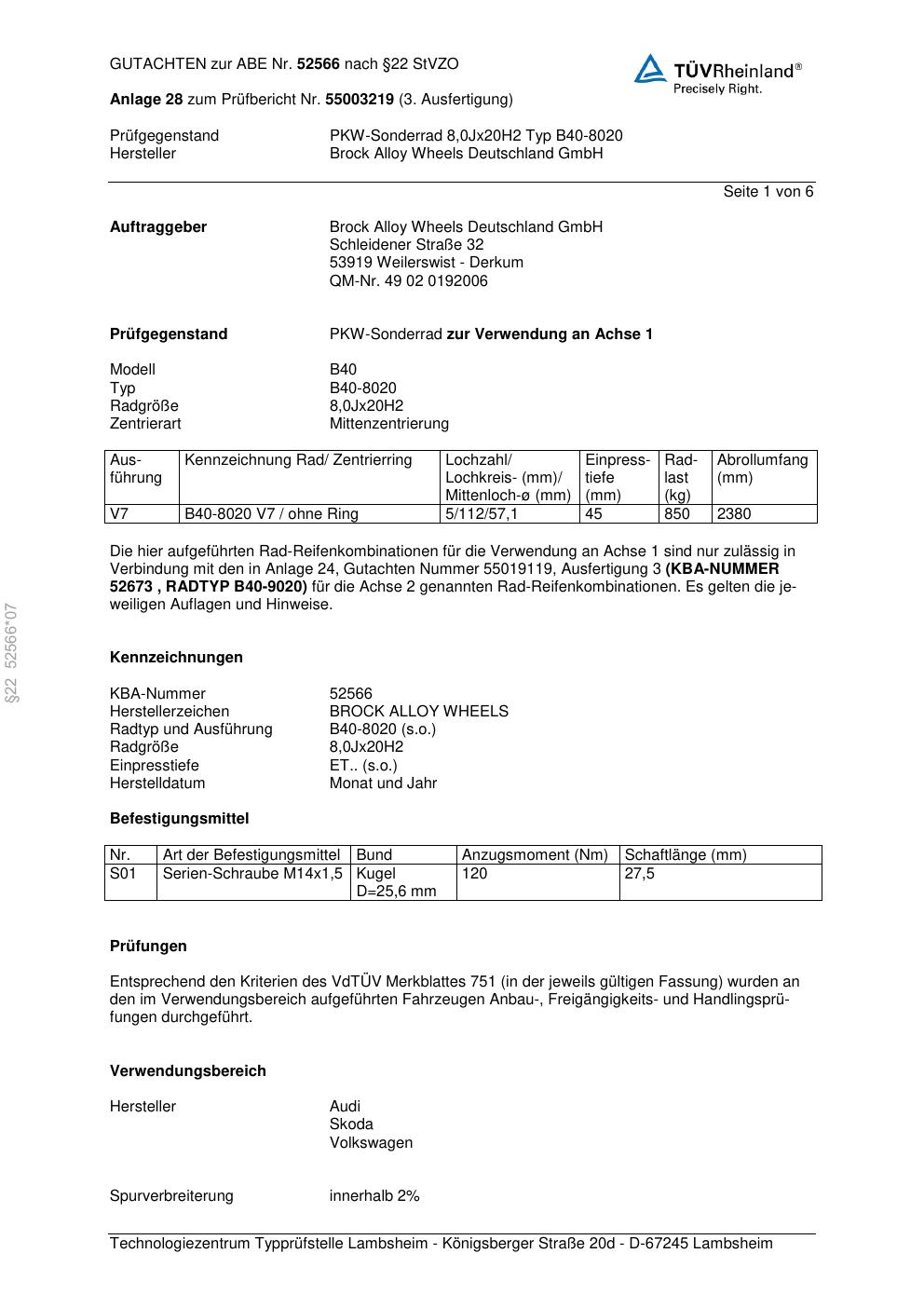 Felgengutachten / abe für Alufelgen Brock B40-8020 (8Jx2 ET 0, Mittenloch 0 mm) mit KBA 52566 (Zertifikatsnummer 52566). Hier kostenlos als PDF herunterladen. Der Download-Link ist 24 Stunden gültig und kann bis zu zwei Mal verwendet werden.