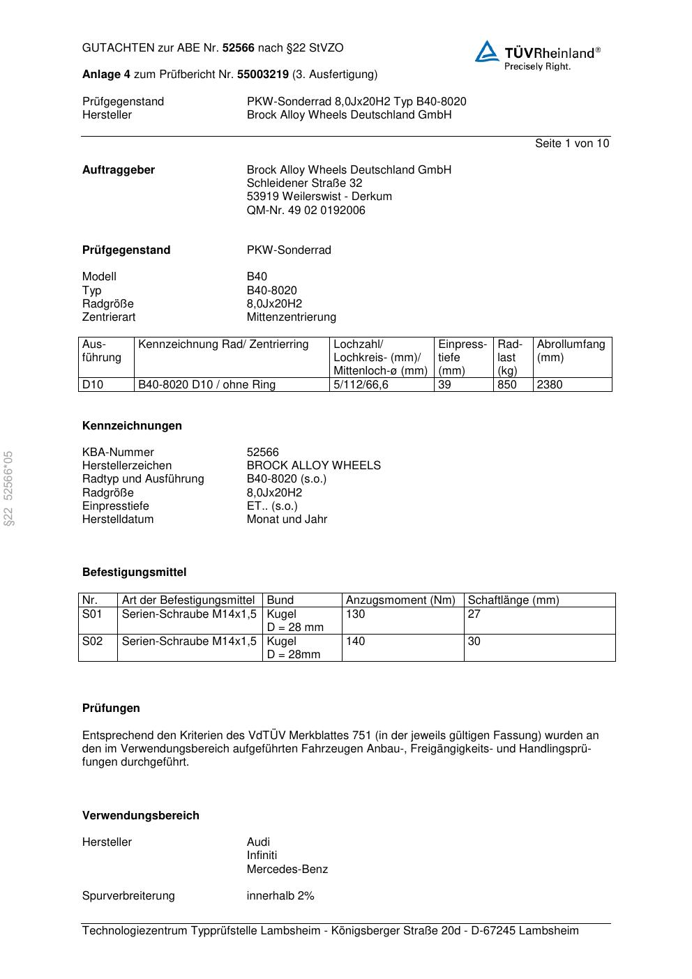 Felgengutachten / abe für Alufelgen Brock B40-8020 (8Jx2 ET 0, Mittenloch 0 mm) mit KBA 52566 (Zertifikatsnummer 52566). Hier kostenlos als PDF herunterladen. Der Download-Link ist 24 Stunden gültig und kann bis zu zwei Mal verwendet werden.