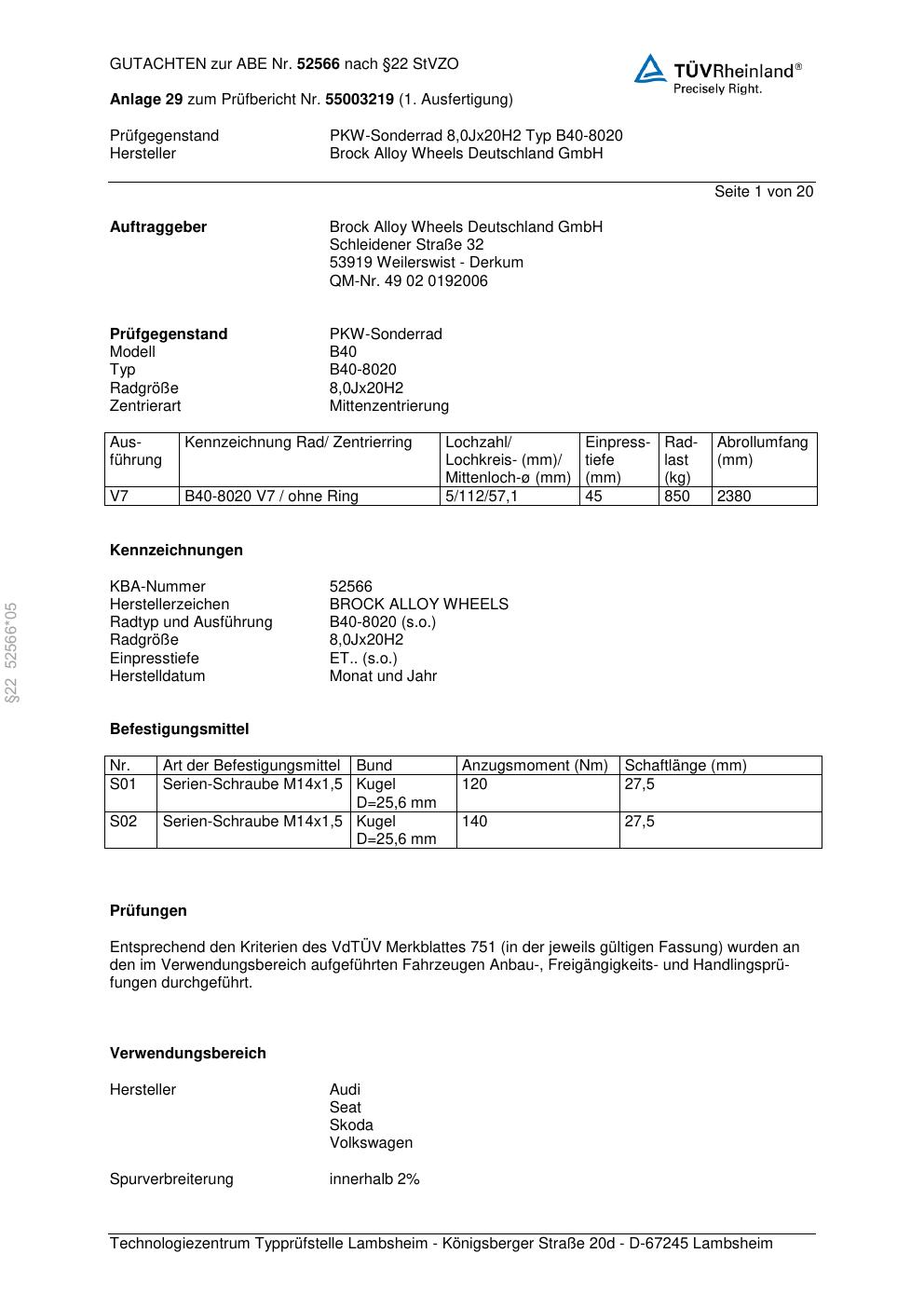 Felgengutachten / abe für Alufelgen Brock B40-8020 (8Jx2 ET 0, Mittenloch 0 mm) mit KBA 52566 (Zertifikatsnummer 52566). Hier kostenlos als PDF herunterladen. Der Download-Link ist 24 Stunden gültig und kann bis zu zwei Mal verwendet werden.